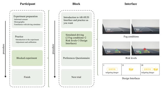 Despite much research on designing various interfaces, there remains a gap in exploring the design of augmented reality (AR) warning interfaces with information redundancy in different hazardous driving scenarios. Specifically, whether the design of redundant warnings in different hazardous scenarios is superior to words-only or symbols-only interfaces. To fill this gap, this study aims to explore the effects of different visual interfaces—words only, symbols only, and combined words–symbols—on drivers’ behavior, usability perceptions, and preferences under different driving scenarios with varying levels of risk and visibility.