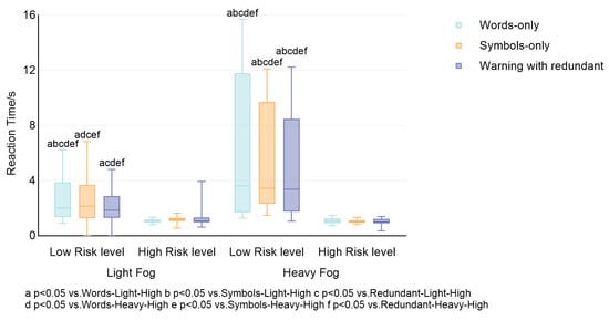 From the mean value of RT, compared to the heavy fog, participants responded faster to the information in the light fog scenario (Mlight = 1.779, Mheavy = 3.522). Participants responded fastest to icons-only (M = 2.525), followed by redundant (icons + words, M = 2.632), and slowest to words-only (M = 2.795). The K-S test was conducted. The results revealed that, under light fog conditions, there were significant differences between low-risk and high-risk scenarios for words-only (Mdlow = 2.020, Mdhigh = 1.110, H = 115.923, p < 0.05) and redundant interfaces (Mdlow = 1.910, Mdhigh = 1.075, H = 93.077, p < 0.05), while no significant difference was observed for symbols-only displays. Under heavy fog conditions, significant differences were found between low-risk and high-risk scenarios for the words-only interface (Mdlow = 3.615, Mdhigh = 1.075, H = 160.442, p < 0.05), symbol-only interface (Mdlow = 3.410, Mdhigh = 1.010, H = 173.096, p < 0.05), and redundant interface (Mdlow = 4.545, Mdhigh = 1.015, H = 170.308, p < 0.05), as shown in Figure 4.