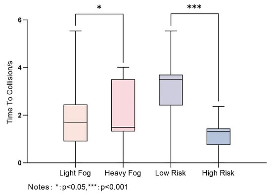 The type of fog (heavy or light) influences driving behavior. With the assistance of the AR-HUD, drivers can identify potential hazards in advance and make appropriate decisions. Therefore, we infer that the reaction time to information provided by the AR-HUD remains consistent under different fog conditions. However, there is a significant difference in TTC. Compared to light fog, drivers may perceive a higher risk of collision in heavy fog, leading to increased vigilance and effective adjustments in driving behavior to extend the time needed to avoid a collision.