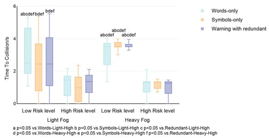 The results indicate that under heavy fog conditions, all three interfaces -words, symbols, and redundant- significantly influence RT across different risk levels. Under light fog conditions, word-based interfaces—words, words + symbols—significantly influence RT across different risk levels. In contrast, the symbols-only interface did not have a significant effect on RT under light fog conditions. Furthermore, regardless of whether the conditions are light fog or heavy, RT in low-risk scenarios is markedly longer than in high-risk scenarios. Based on the subsequent data on time-to-collision (TTC) and the following data on acceleration, Hypothesis 1 was supported. This suggests that responses and actions may be slower in low-risk situations and faster in high-risk situations.
