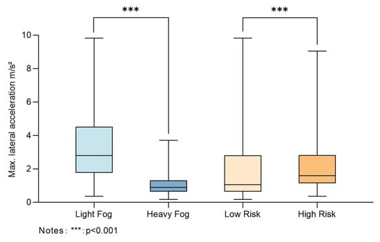 Under high-risk conditions, both the maximum longitudinal and lateral accelerations were significantly larger than those observed in low-risk conditions. This suggested that when drivers perceive greater risk, they may adopt more assertive and decisive driving behaviors, such as sharper steering, acceleration, or deceleration, to reduce the potential for collisions. This finding aligns with our expectations that drivers in high-risk environments must respond quickly to potential emergencies, leading to increased longitudinal and lateral vehicle accelerations. Such reactions can be interpreted as instinctive actions by the driver to avoid collisions or mitigate the consequences of accidents through rapid vehicle control. This is consistent with existing research, which indicates that drivers exhibit more aggressive handling behaviors in high-risk situations. Moreover, the maximum lateral acceleration under light fog conditions was significantly larger than that under heavy fog, indicating that reduced visibility has a notable impact on driving behavior. In heavy fog, poor visibility may prompt drivers to slow down and minimize abrupt maneuvers, such as sharp turns, to ensure safety. In contrast, under light fog conditions, although visibility is somewhat reduced, drivers maintain a certain level of confidence and tend to respond more quickly, resulting in higher values of lateral accelerations.
