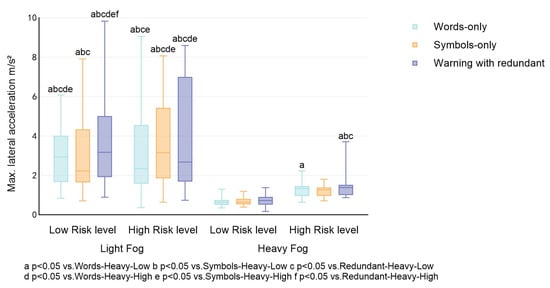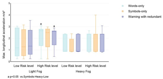 Figure 9 displayed the percentage distribution of maximum longitudinal acceleration of the AR-HUD interfaces (words-only, symbols-only, redundant interfaces) across various fog conditions and risk levels. The M-W test results indicated that the median value of maximum longitudinal acceleration recorded under high-risk levels is significantly greater than that under low-risk levels, with a statistically significant difference (Mdhigh = 2.36, Mdlow = 0.91, p < 0.05). In terms of the three interfaces, the combination of words and symbols (warning with redundant) resulted in the highest maximum acceleration (1.750), followed by words-only (1.712), with symbols-only yielding the lowest value (1.646), but the effect of different interfaces on maximum longitudinal acceleration did not reach a statistically significant difference.
