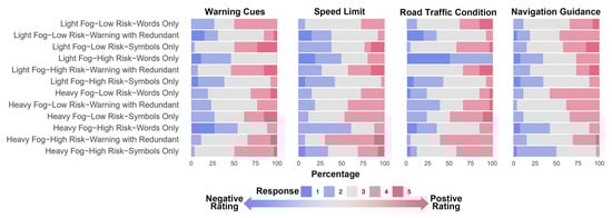 For a more comprehensive visual presentation, Figure 10 presents the scores obtained for the information that appeared in this study. Diverging stacked bar charts plot the results of PPQ. This type of chart is recommended for presenting Likert scale results by Richard and Robbins []. Among the warning message designs, subjects preferred the redundant design, especially in high-risk situations. In heavy fog and high-risk conditions, the percentage of the high-rating group was approximately 35%, while in the light fog and high-risk conditions, the percentage of the high-rating group was about 50%.
