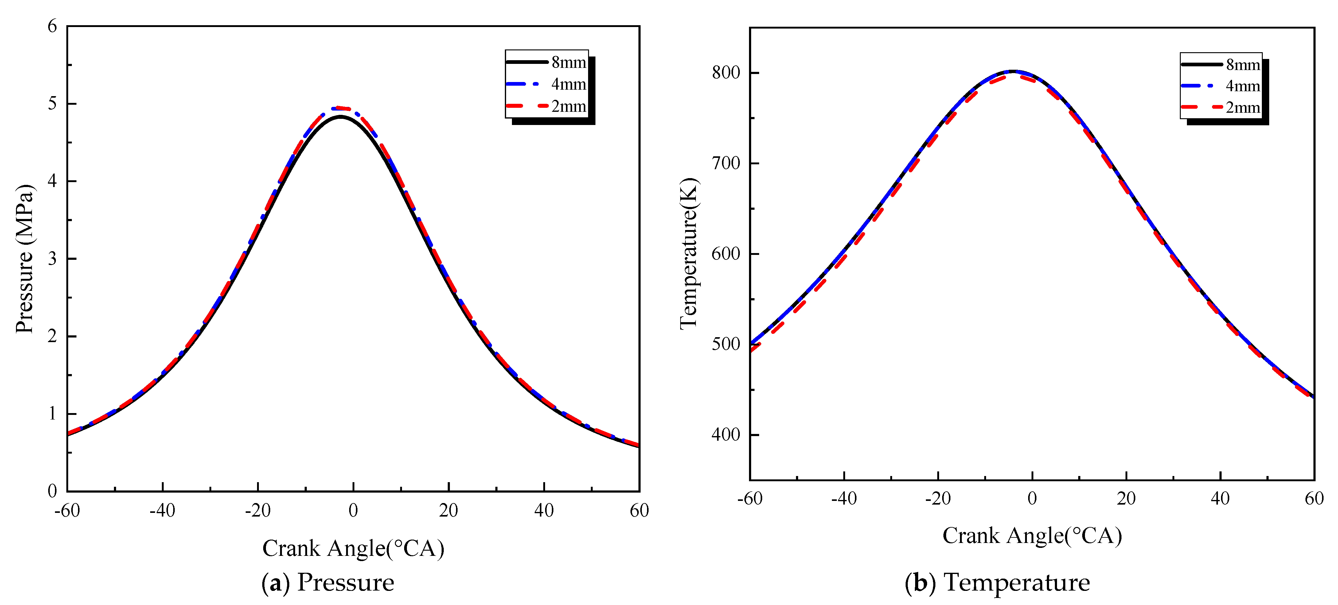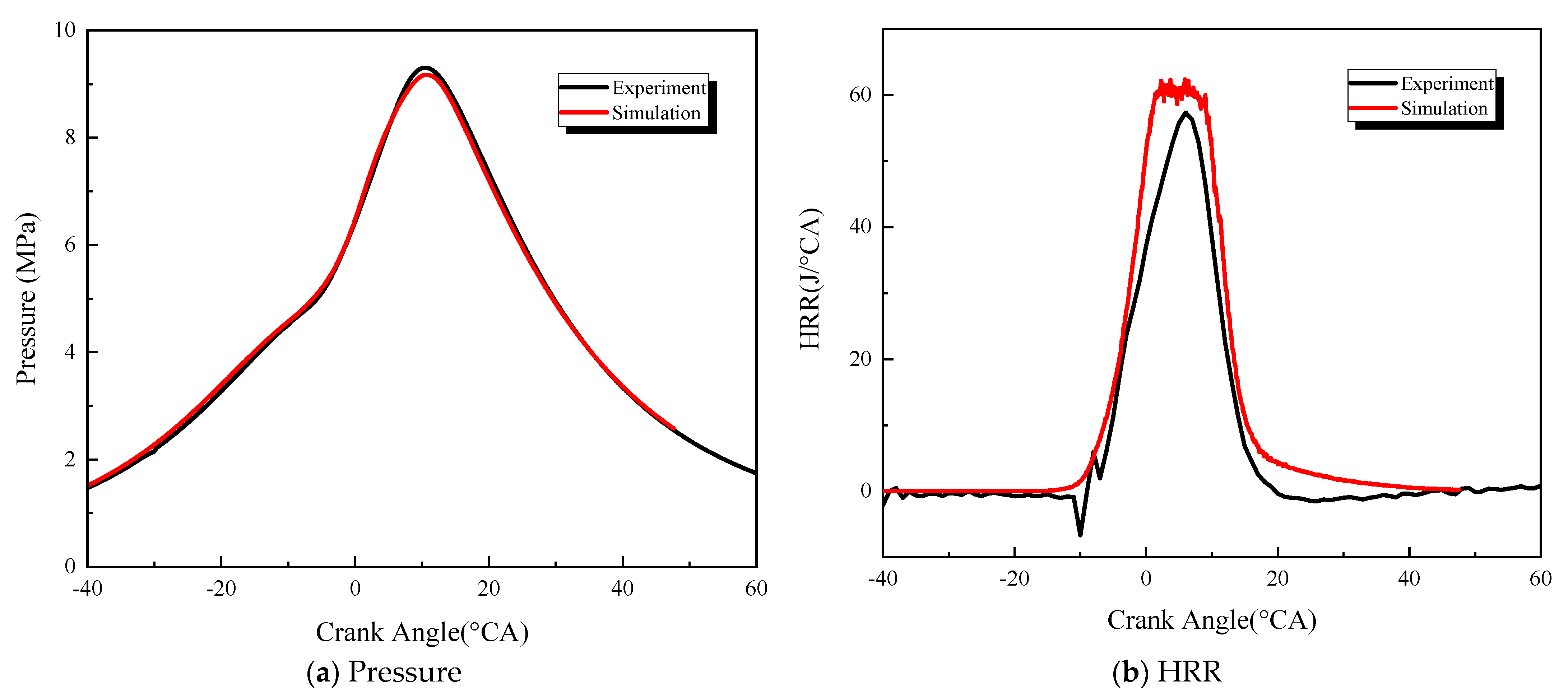 The combustion process in an engine is generally categorized into three phases: the ignition delay period, the combustion duration period, and the afterburning period. In this study, the crank angles at which 10%, 50%, and 90% of the total cumulative heat release were achieved were defined as CA10, CA50, and CA90, respectively. The ignition delay period was calculated as the crankshaft interval from the spark timing to CA10. The combustion duration period is defined as the crankshaft interval from CA10 to CA90. The afterburning period represents the crankshaft interval from CA90 to the point at which the fuel is nearly completely combustion. CA50, also known as the combustion center, serves as a critical parameter for assessing the overall combustion process, as it typically indicates the phasing of combustion and the closeness to constant-volume combustion.