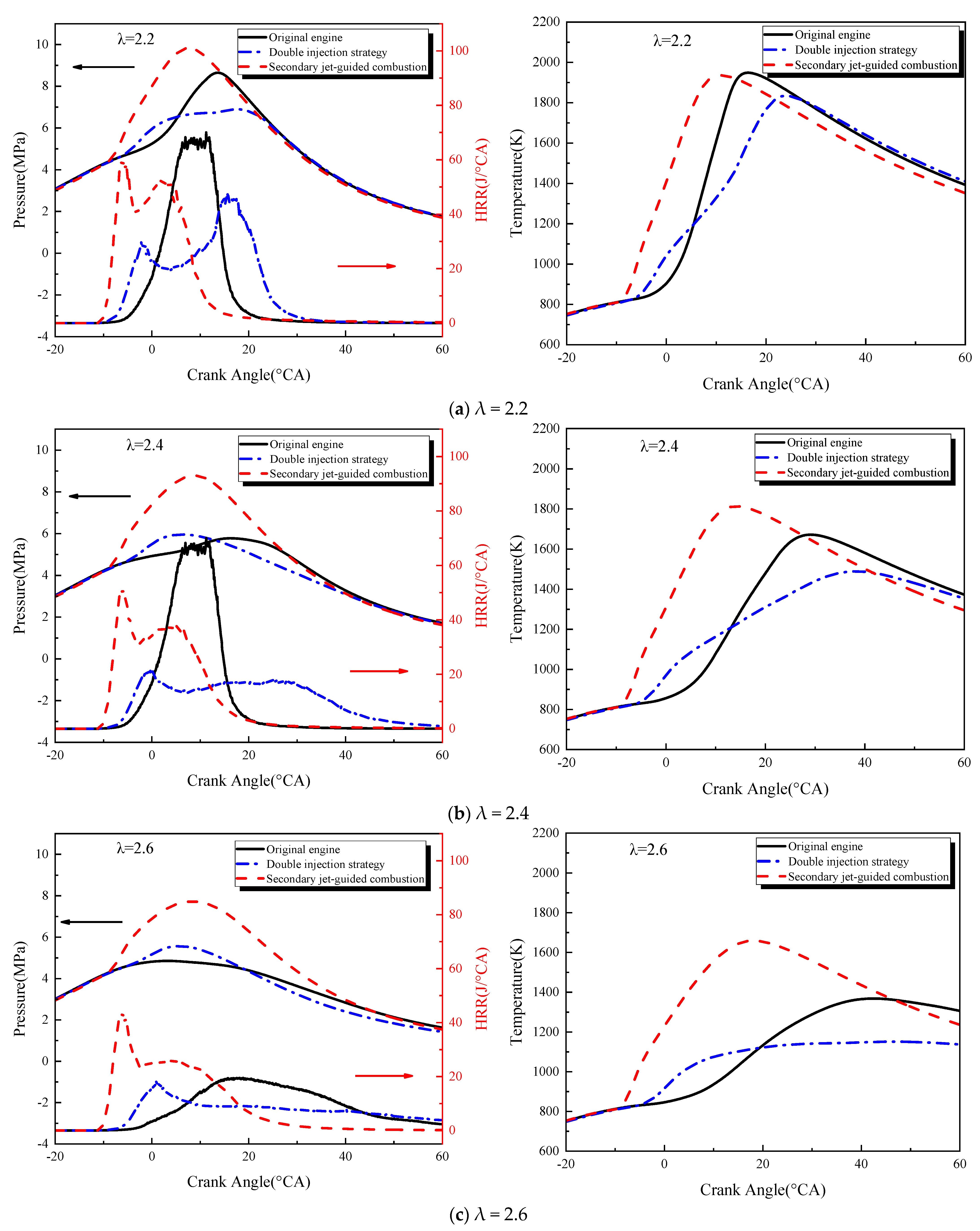 Figure 6a, the secondary jet-guided combustion strategy exhibited the shortest ignition delay across all conditions, whereas the original engine showed the longest delay. This explained why HRR, pressure, and temperature rose earlier under the secondary jet-guided and dual-injection strategies compared to the original engine. With increasing λ, the ignition delay period extended noticeably for both the original engine and the double injection strategy, while it remained largely stable for the secondary jet-guided combustion approach. This indicated markedly enhanced ignition and early combustion stability with the secondary jet-guided mode.
