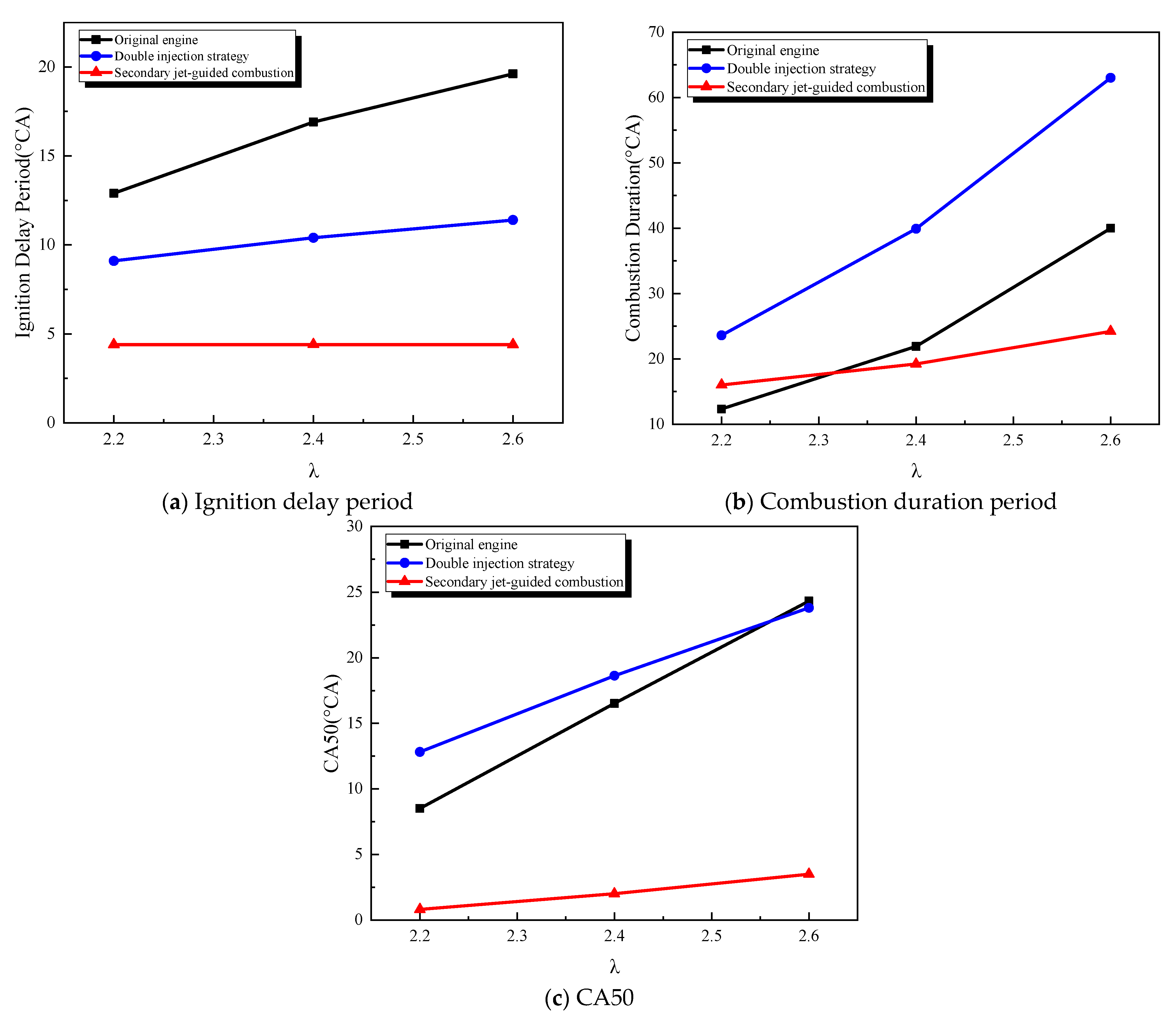 Figure 6 illustrates the ignition delay period, combustion duration period, and CA50 for the three strategies as functions of λ. As seen in