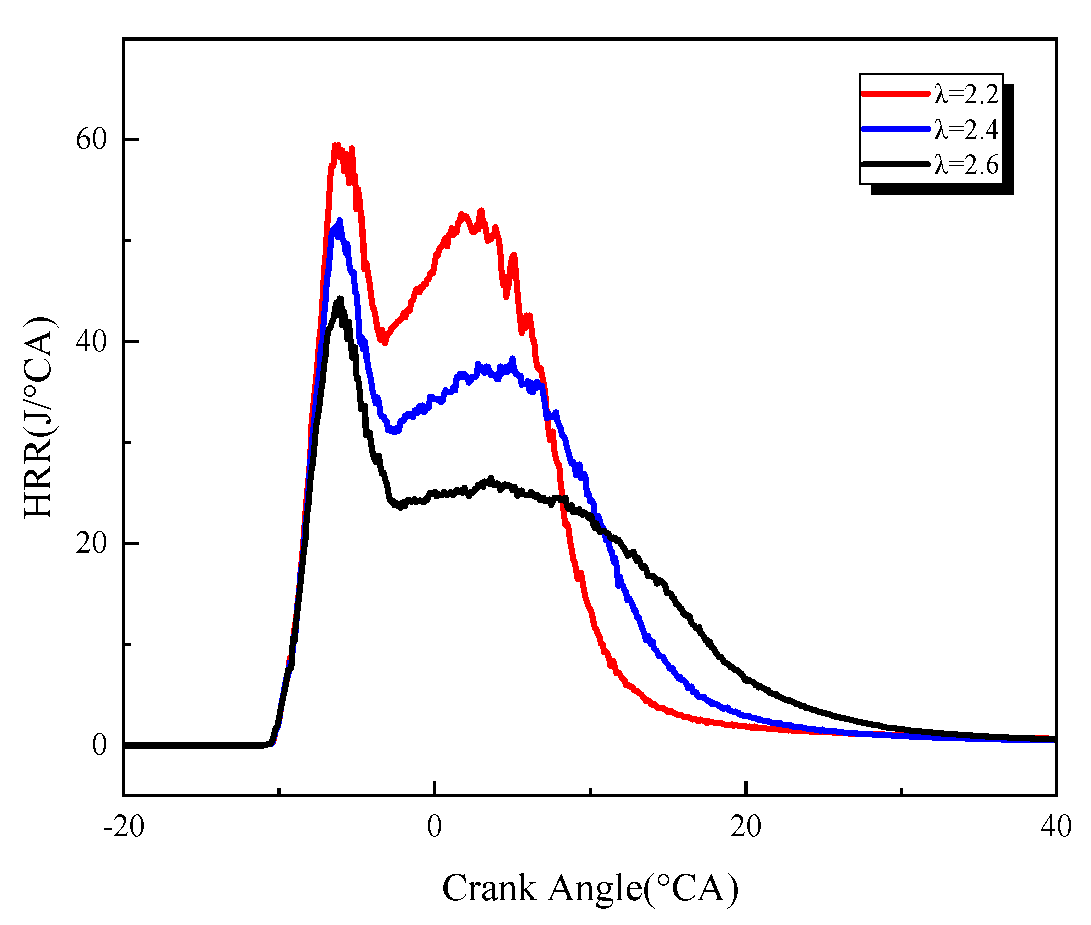 Figure 5, the first peak of the HRR curve in secondary jet-guided combustion remained almost unaffected by changes in λ, whereas the second HRR peak decreased in magnitude and broadened in duration as λ increased.