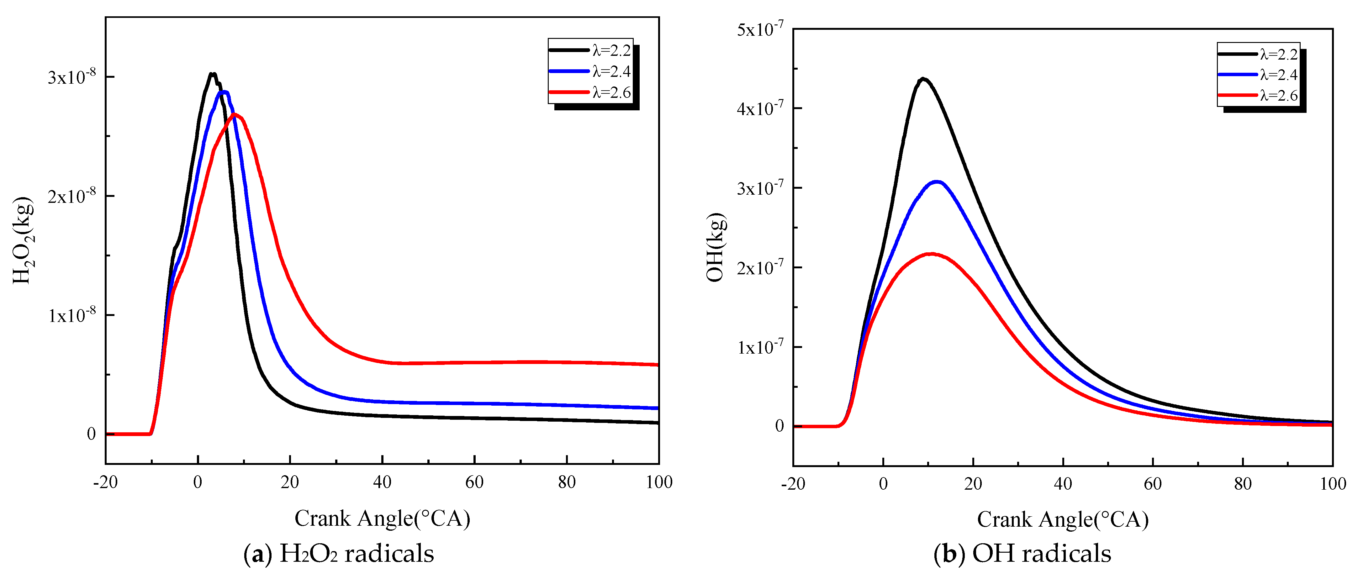 Figure 8b, the concentration of OH radicals rose rapidly to a peak after ignition and then decreased sharply. With increasing λ, the peak value showed a notable decreasing trend, reflecting a reduction in reaction intensity. This decline in OH radical concentration correlates with the gradual decrease in the diffusion peak of HRR for secondary jet-guided combustion as λ increases, as previously shown in