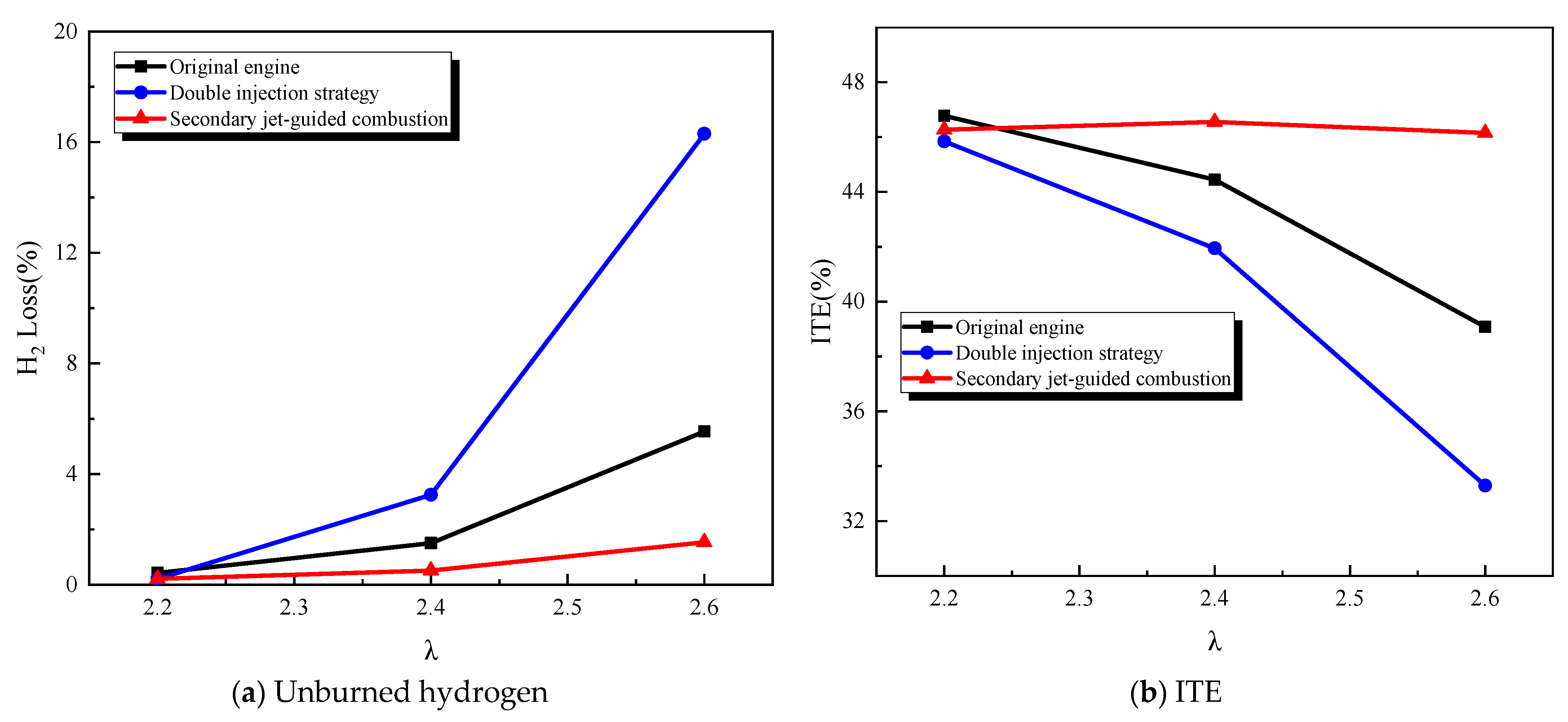 Figure 9b, is largely inverse to that of unburned hydrogen. ITE gradually decreases as λ increases. The secondary jet-guided combustion strategy was the least affected by changes in λ, allowing it to maintain high ITE even under increasingly lean conditions. At λ = 2.4, it achieved the highest ITE (46.55%) among all operating points, and even at the extremely lean condition of λ = 2.6, the indicated thermal efficiency remained as high as 46.15%. In contrast, the double injection strategy exhibited the largest variation in ITE and consistently performed at the lowest efficiency level across all λ values.