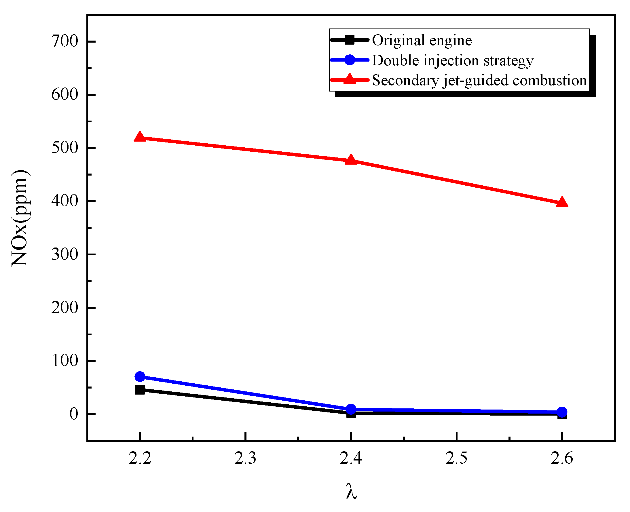 Table 10, the increase in λ primarily reduces the intensity of premixed combustion during the diffusion combustion dominated phase. Thanks to its robust combustion characteristics, the secondary jet-guided combustion strategy maintained stable combustion even under high λ conditions, resulting in the smallest increase in unburned hydrogen emissions with rising λ. As observed in