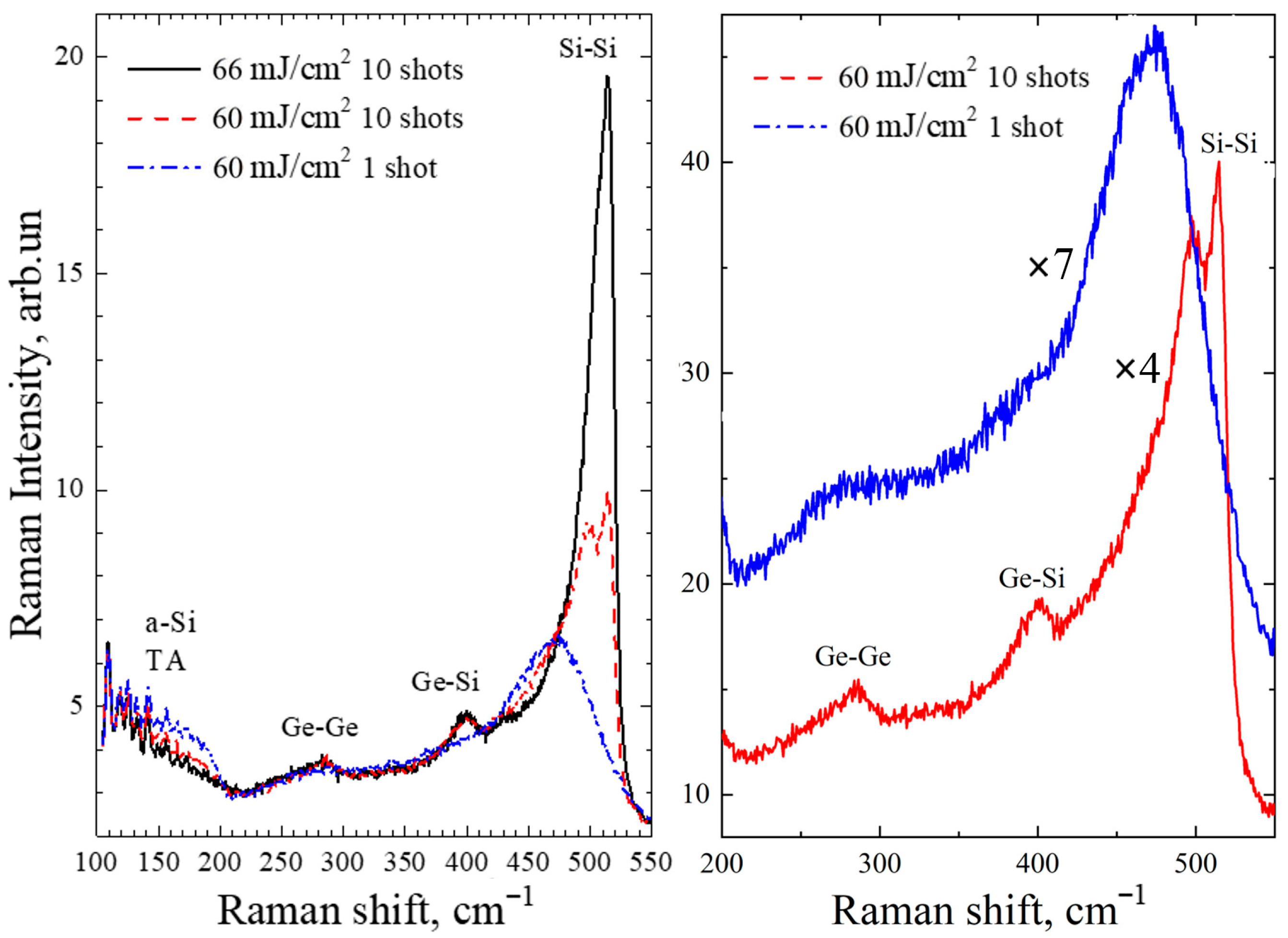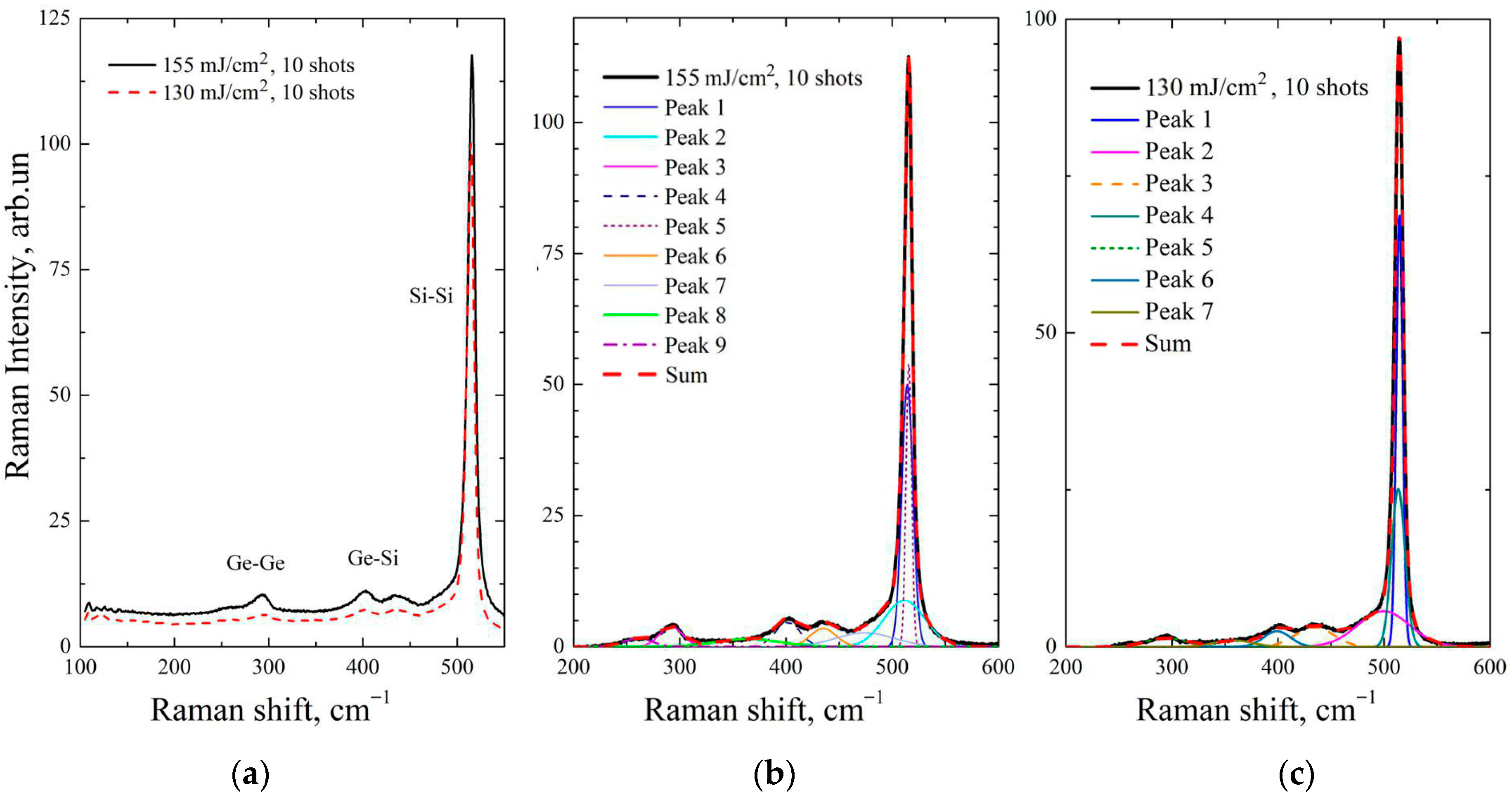 - Bulgakov, A.V.; Beranek, J.; Volodin, V.A.; Cheng, Y.; Levy, Y.; Nagisetty, S.S.; Zukerstein, M.; Popov, A.A.; Bulgakova, N.M. Ultrafast infrared laser crystallization of amorphous Si/Ge multilayer structures. Materials 2023, 16, 3572. [Google Scholar] [CrossRef] [PubMed]