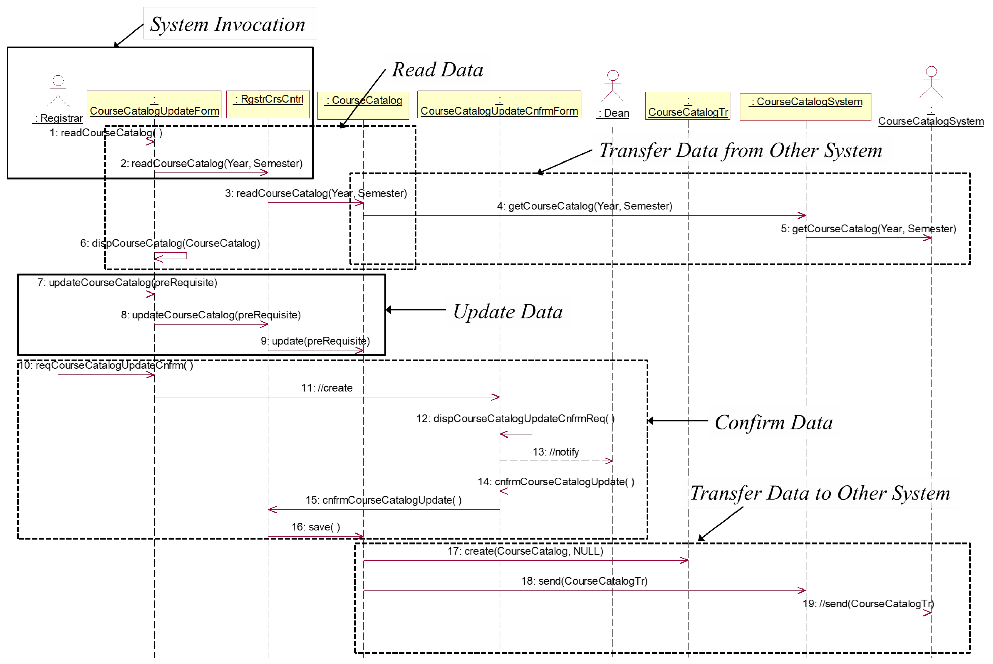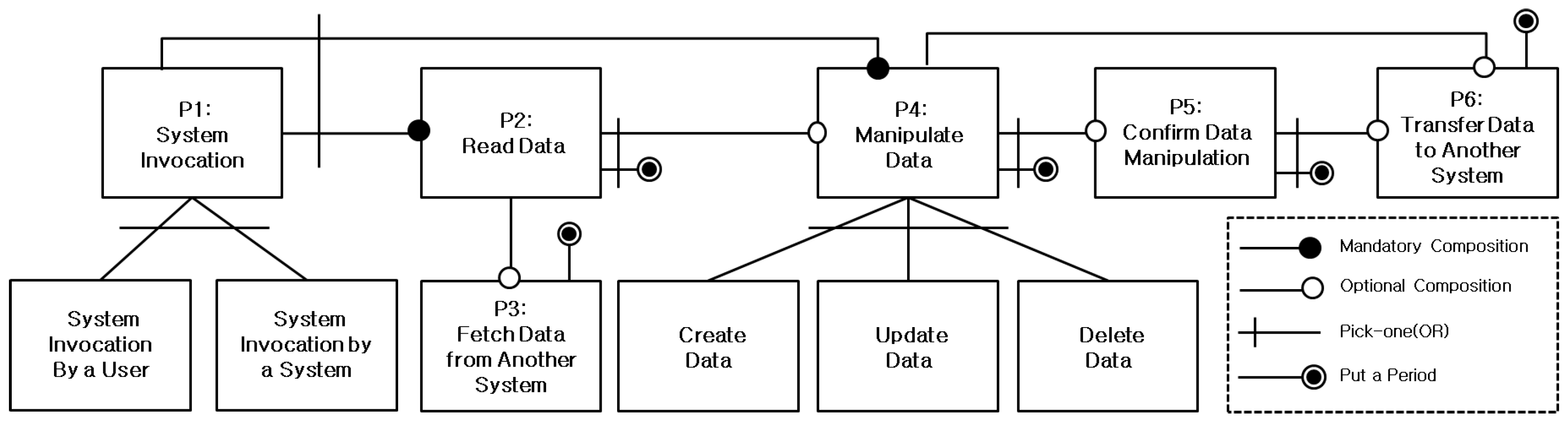 Figure A2. For each scenario, the analysis model can be constructed by combining a minimum of two and up to six patterns. Essential operations, such as data reading and updating, must always be included, while other actions, like sending or receiving external messages, are included as required by the scenario. This pattern graph provides structured guidance for scenario modeling, helping to define the order of pattern composition, distinguish between mandatory and optional patterns, and support the automated generation of sequence diagrams. This case is illustrated in