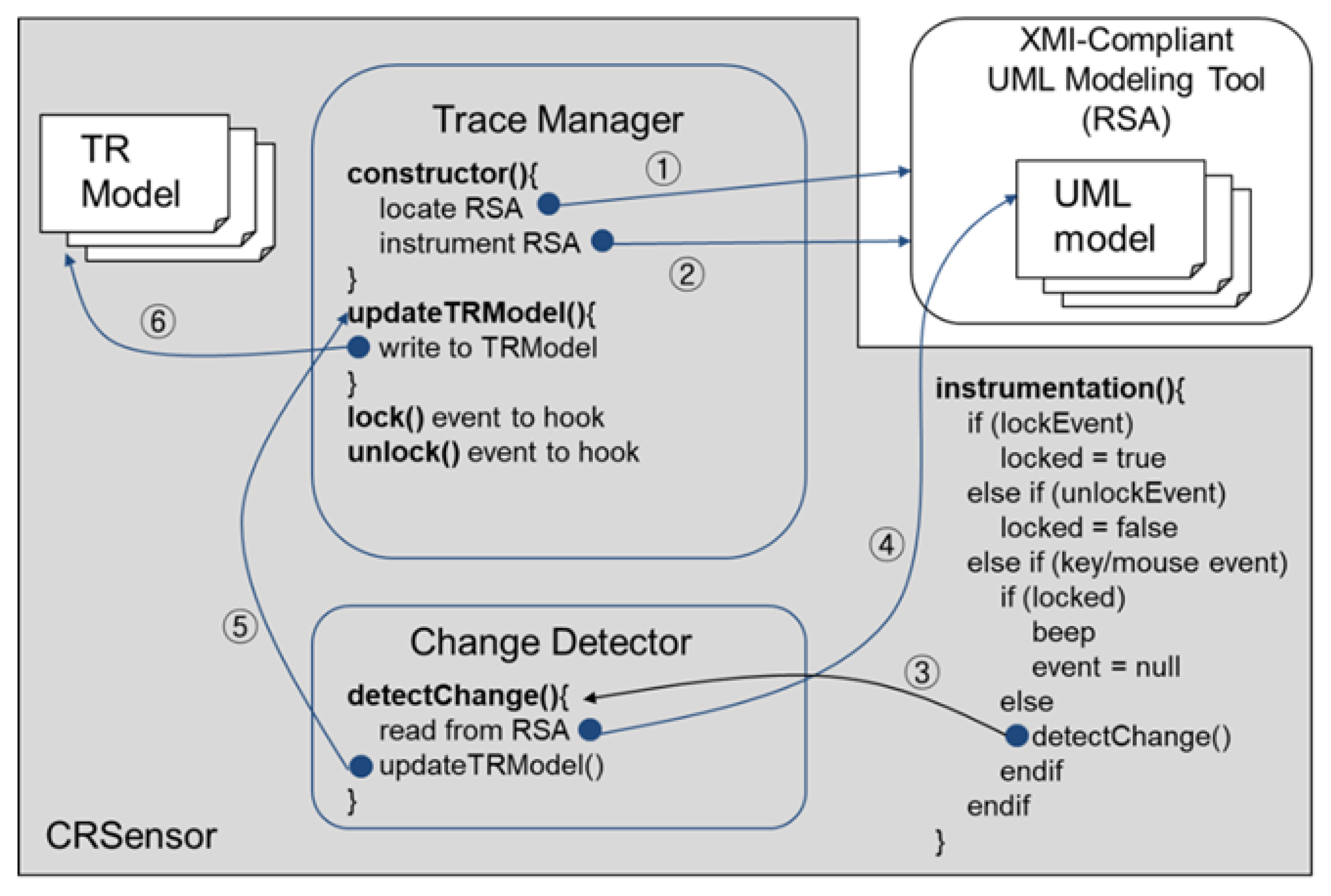 Figure 6 provides a detailed description of each architectural function. When RSA is launched, the TraceManager responds by activating the instrumentation interface (step 1) and locating the RSA modeling environment to initiate UML model change management (step 2). As the user performs creation, modification, or deletion in the UML model, the instrumentation layer responds in real time, capturing all such events (step 3). The ChangeDetector classifies and extracts event data via hooking (step 4) and, upon detecting a valid model change, updates intermediate structures and passes the information to the TraceManager for traceability management (step 5). During synchronization, CRSensor temporarily locks the RSA model (step 6) to ensure strict data consistency and transactional integrity between models during updates.