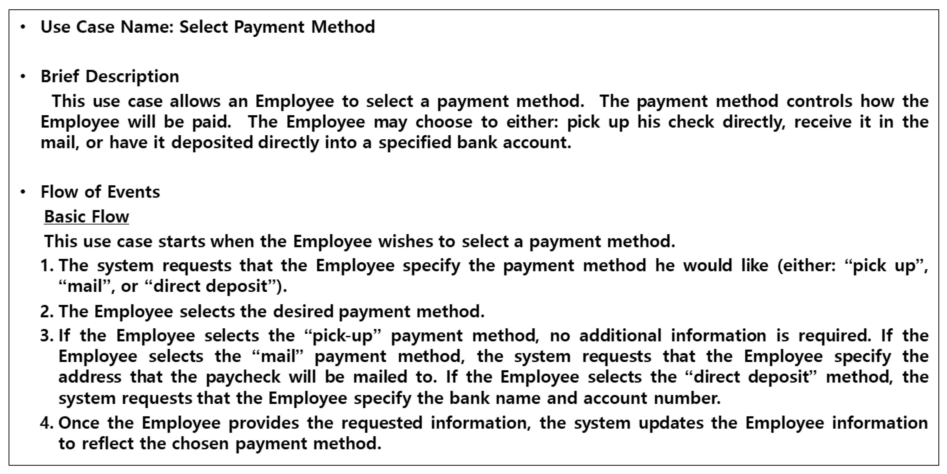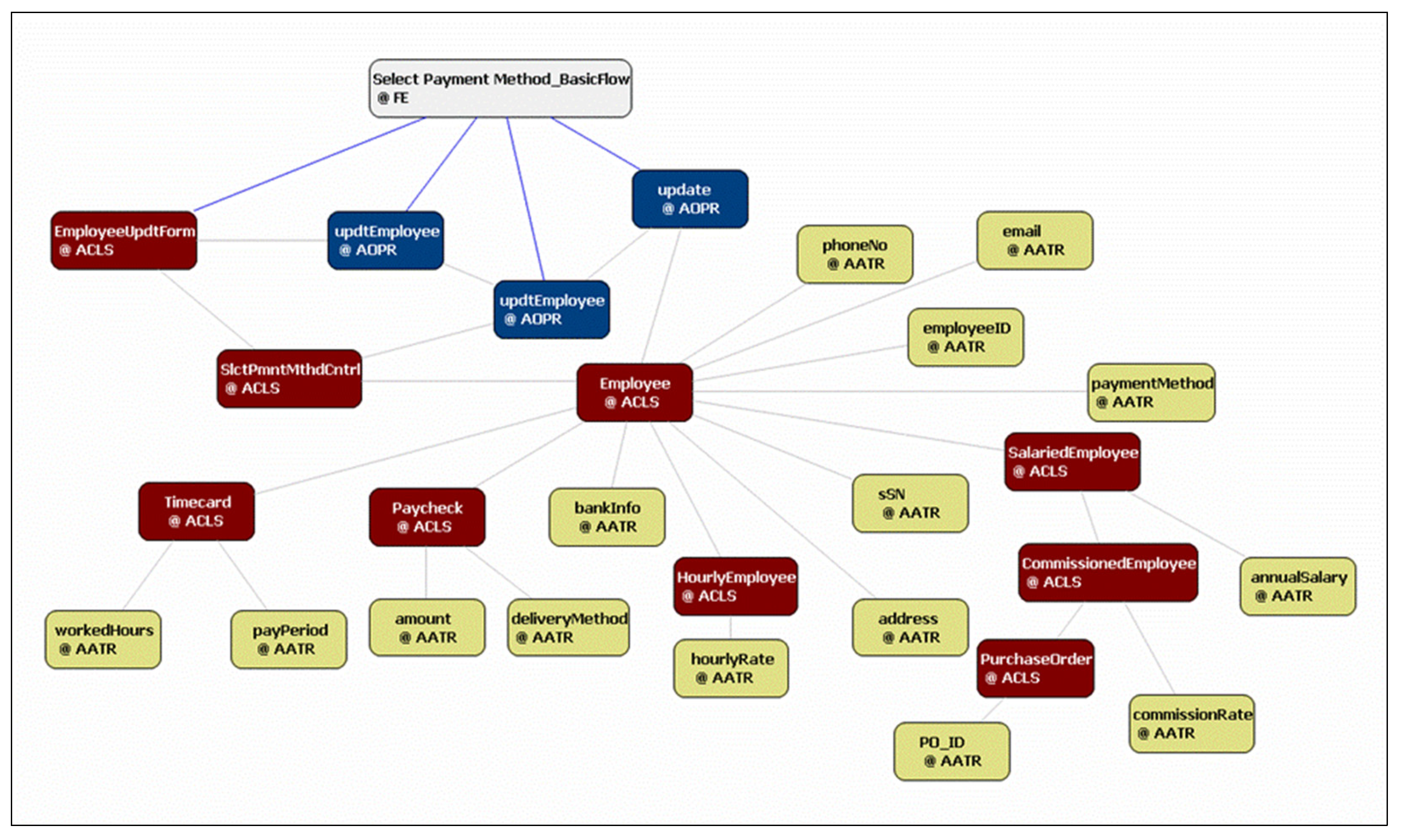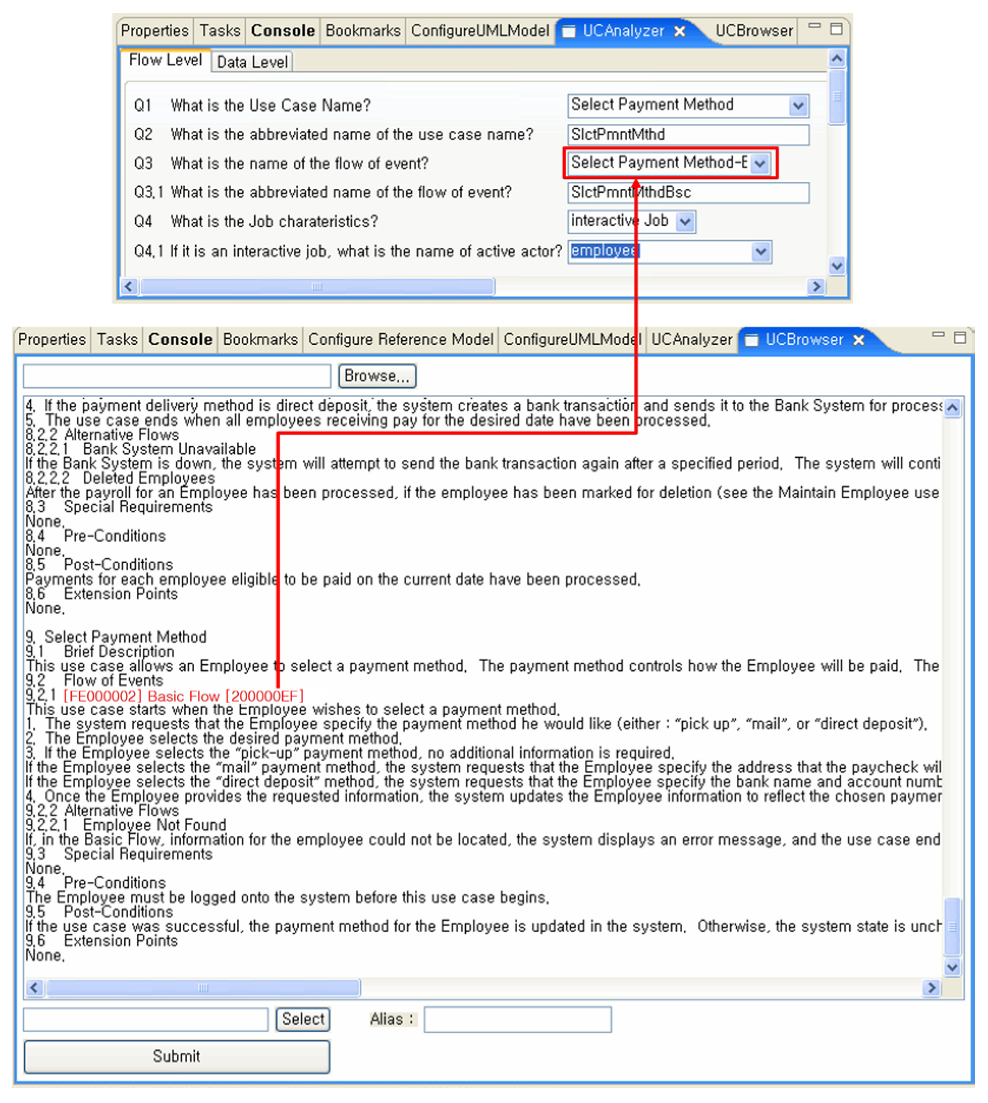 Select Payment Method, which generates a small number of analysis model elements to illustrate the internally produced data diagrammatically. Additional examples of CRSensor input and output values for basic flows involving a larger number of analysis elements are provided in