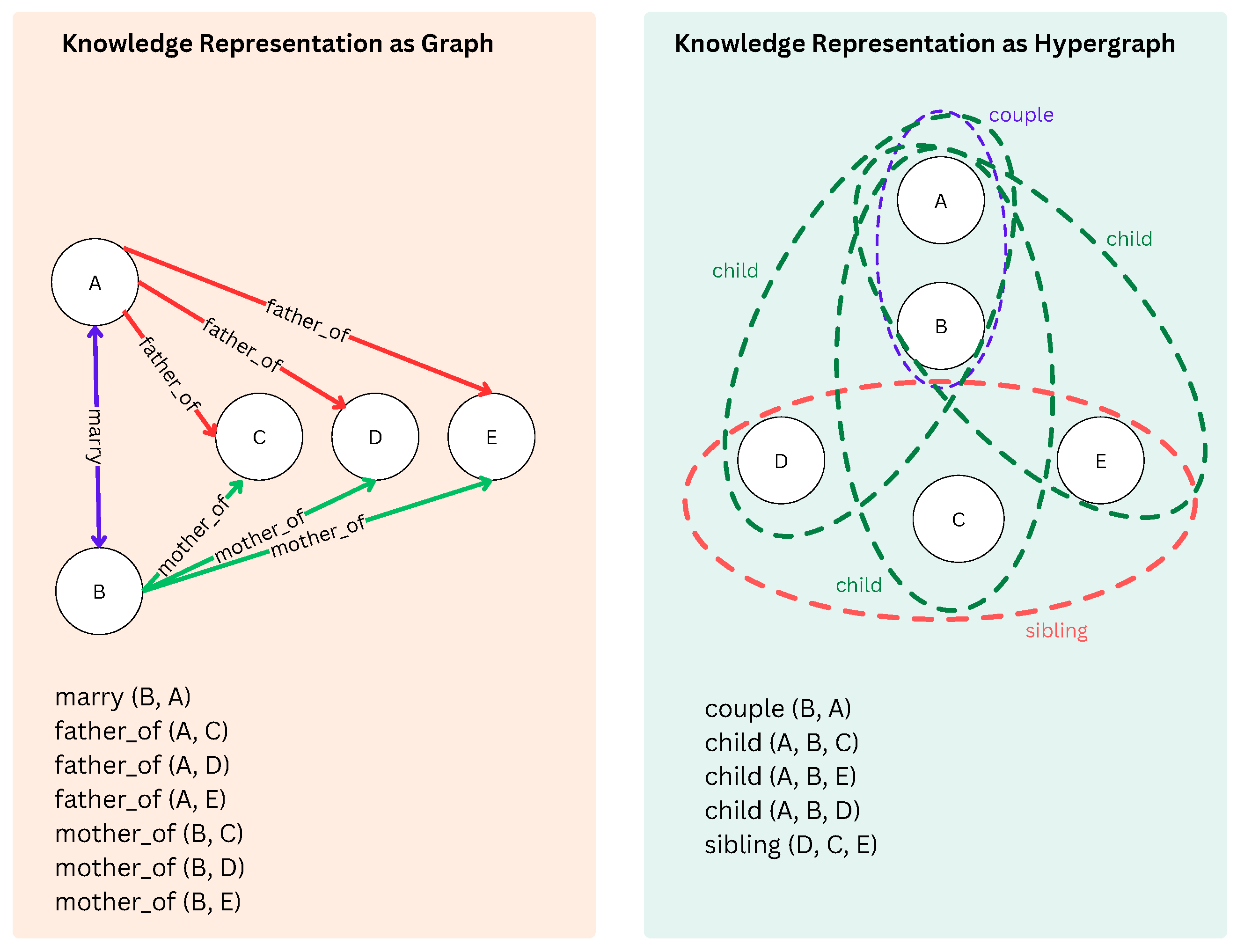 Figure 1. The left panel illustrates a traditional graph representation, where pairwise directed edges encode relationships such as “father_of” and “mother_of” between vertices