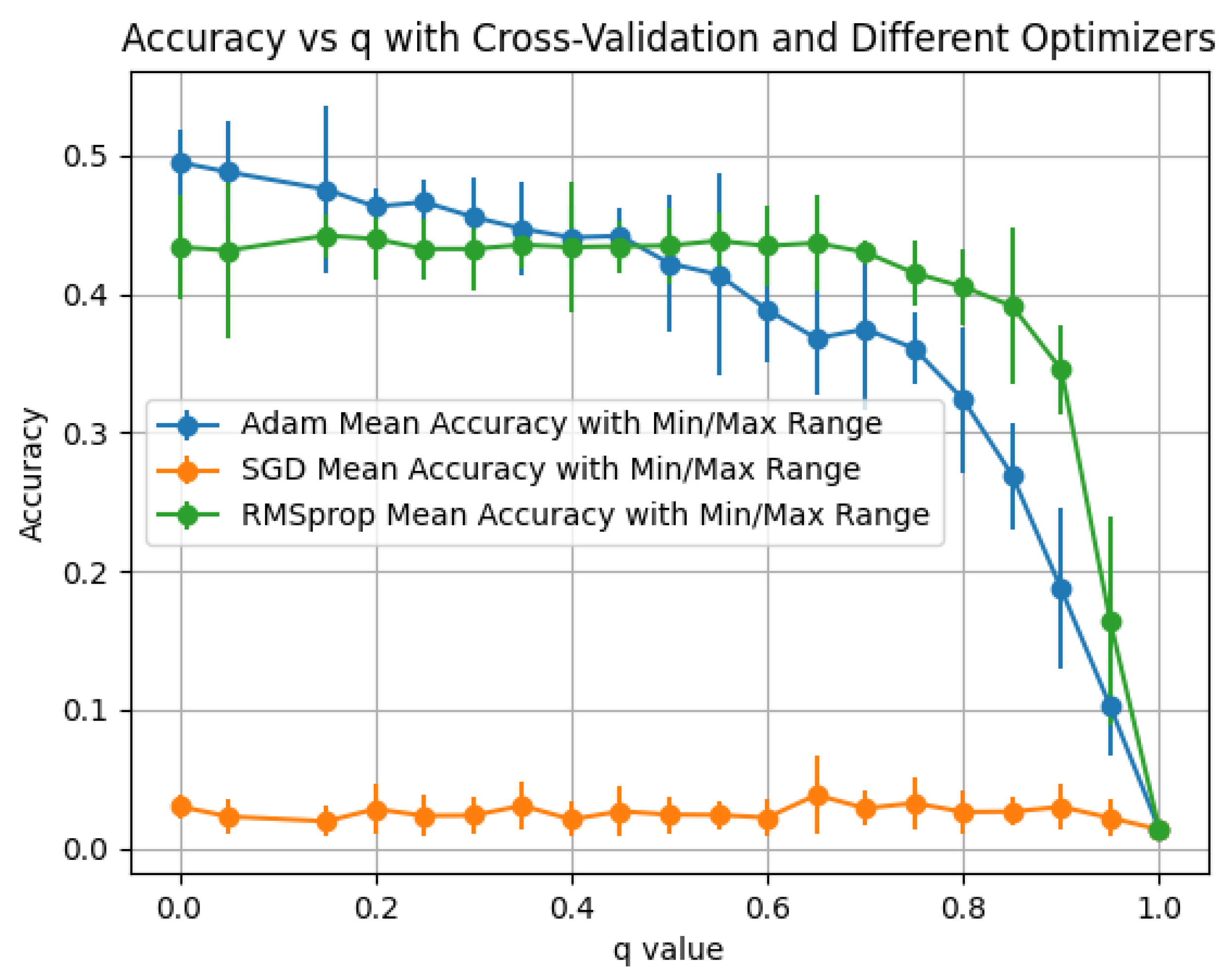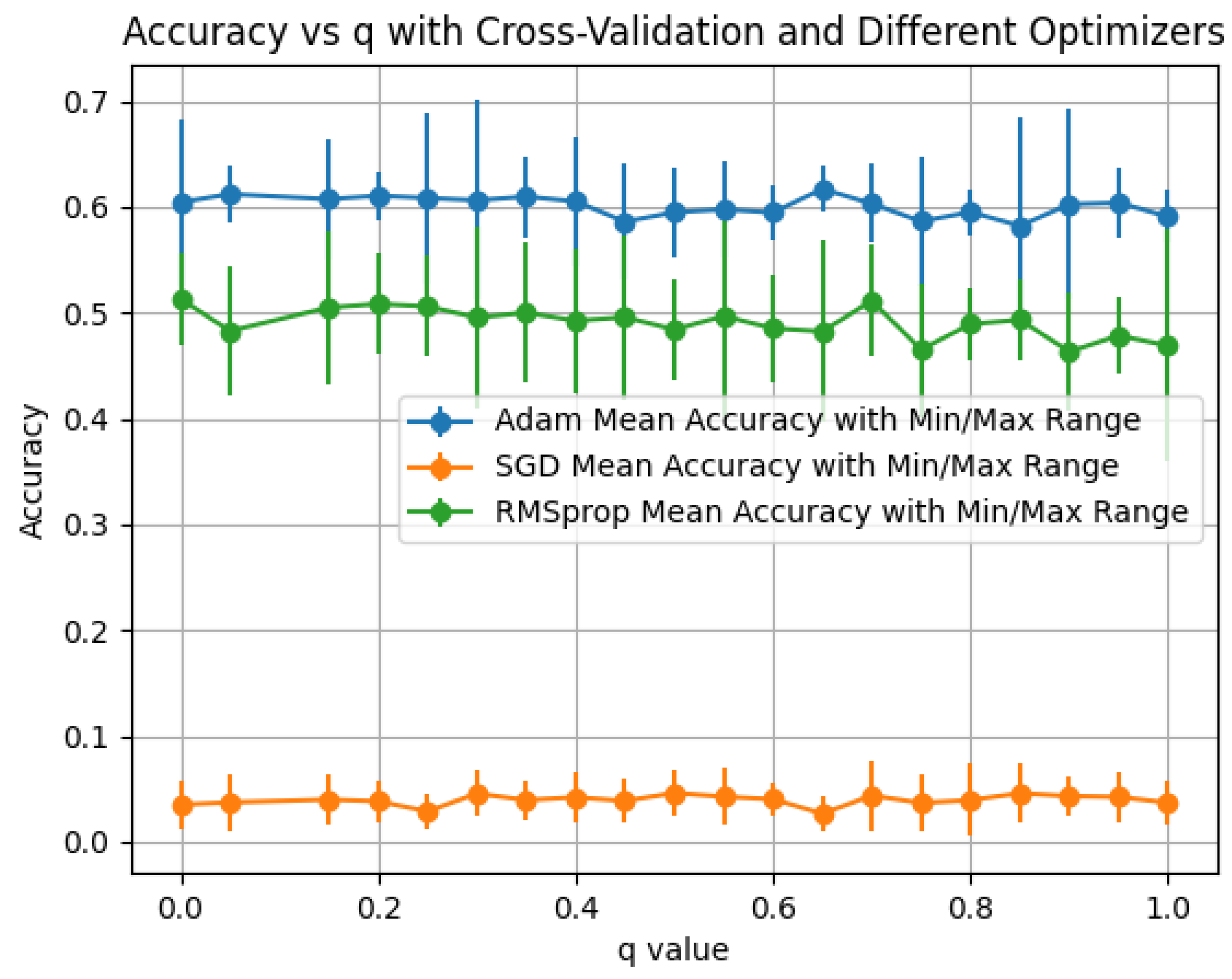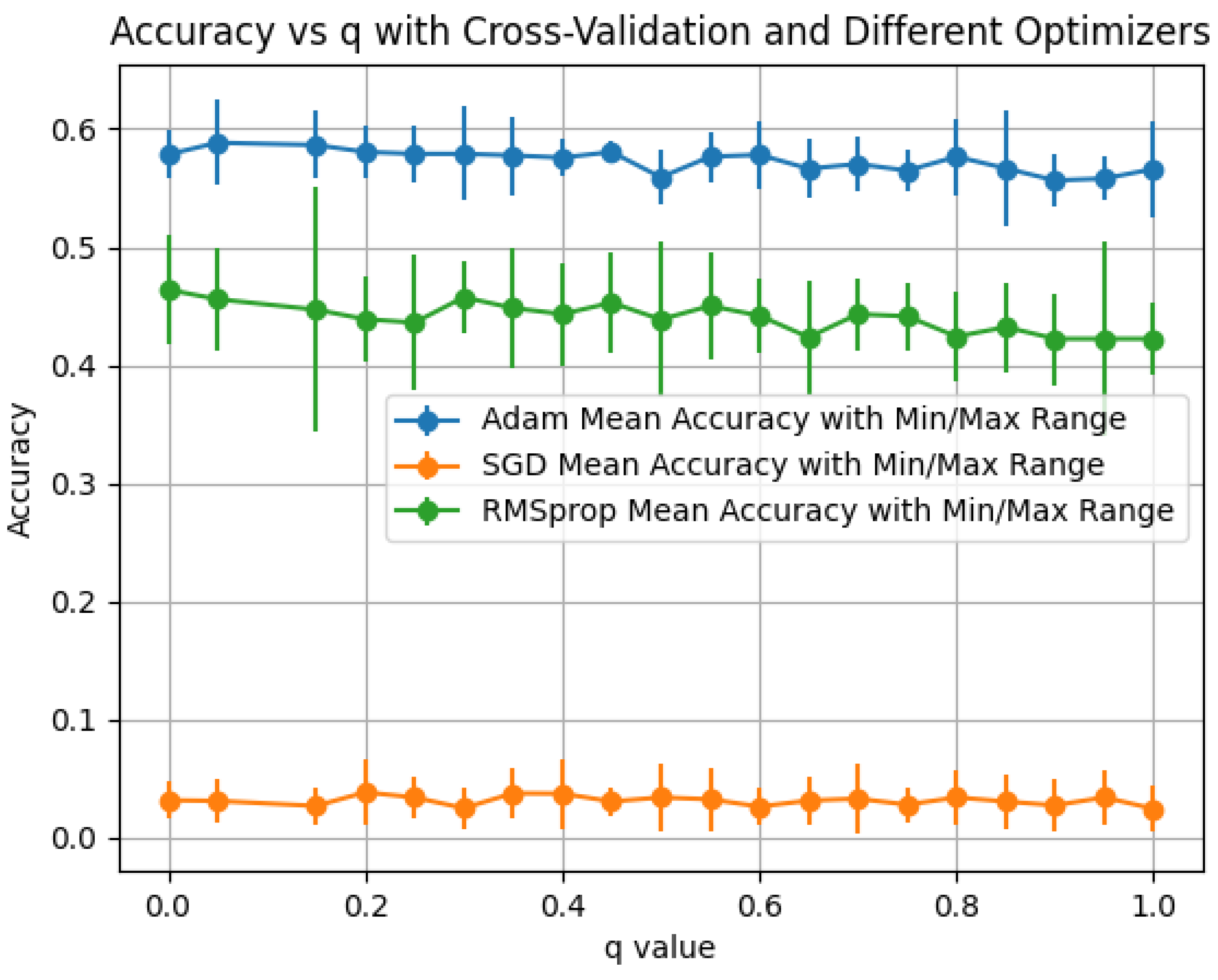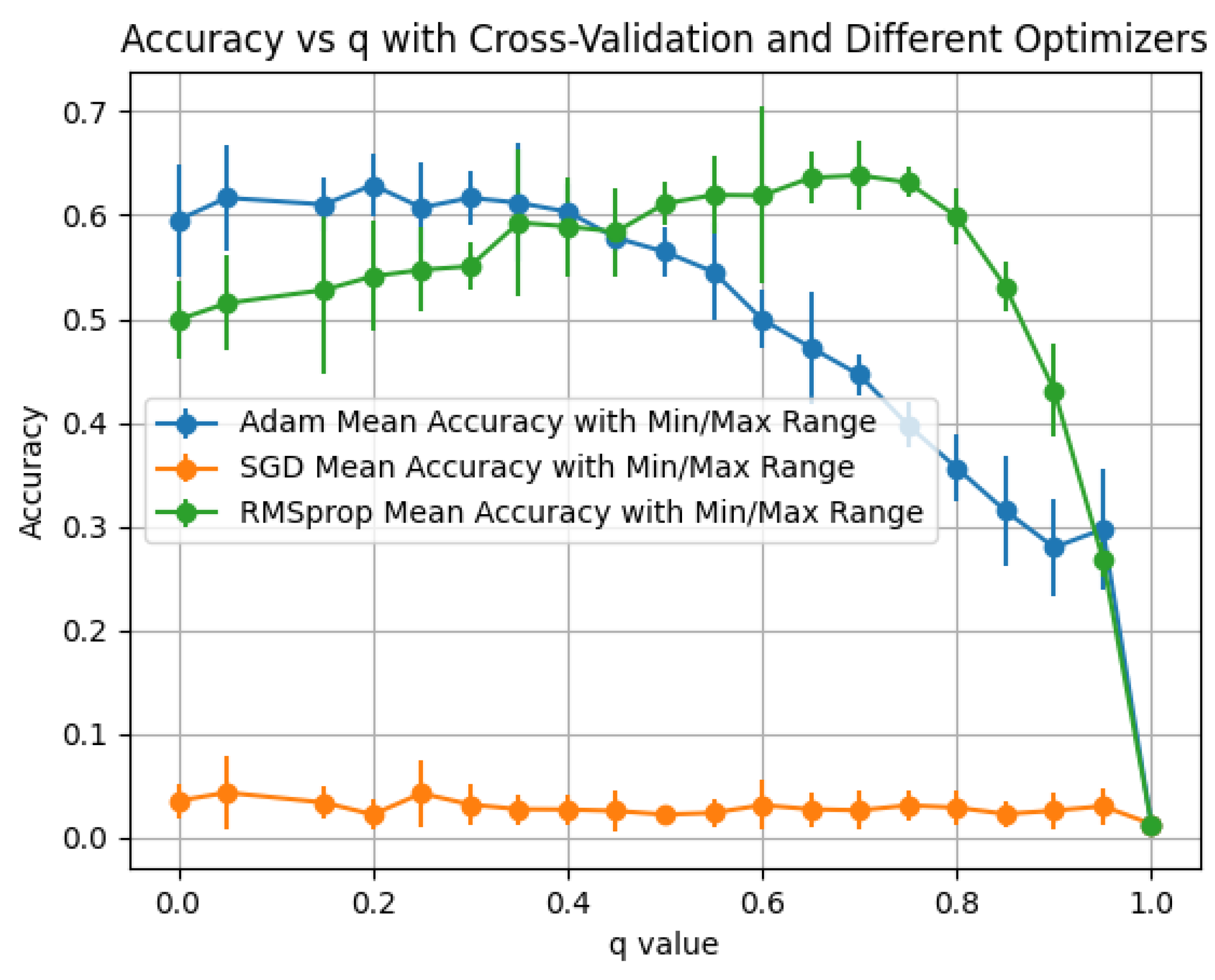 We evaluate the q-mixed propagation and summarize performance by optimizer for each activation. Plots report the mean accuracy with min–max error bars across the folds/seeds of our protocol.