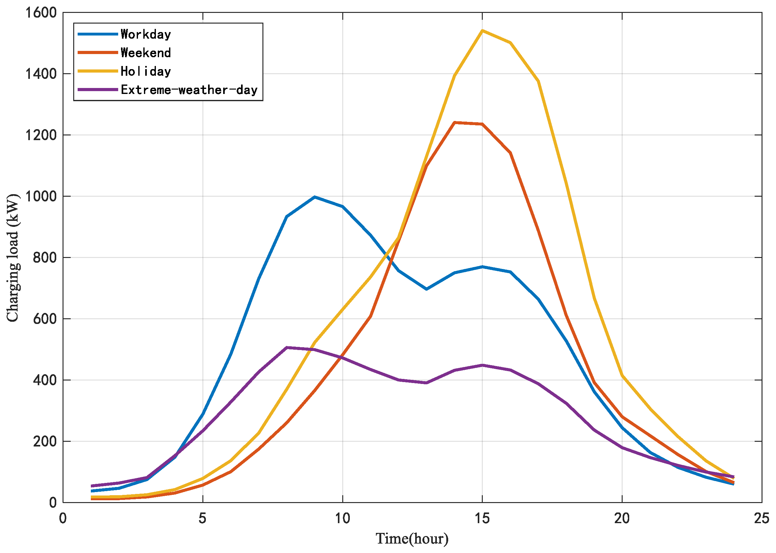 According to hierarchical theory, the traffic flow characteristics of the macroscopic layer serve as conditional variables for the state transition matrices of the other two layers. Based on the frequency of occurrence in historical data, four representative scenarios—workdays, weekends, holidays, and extreme weather days—are selected in each simulation. These scenarios exhibit distinct trends and amplitudes in the charging load curves. The forecasting model is applied to predict the total charging load across the four highway service areas within this section, and the scenario-specific load profiles are illustrated in