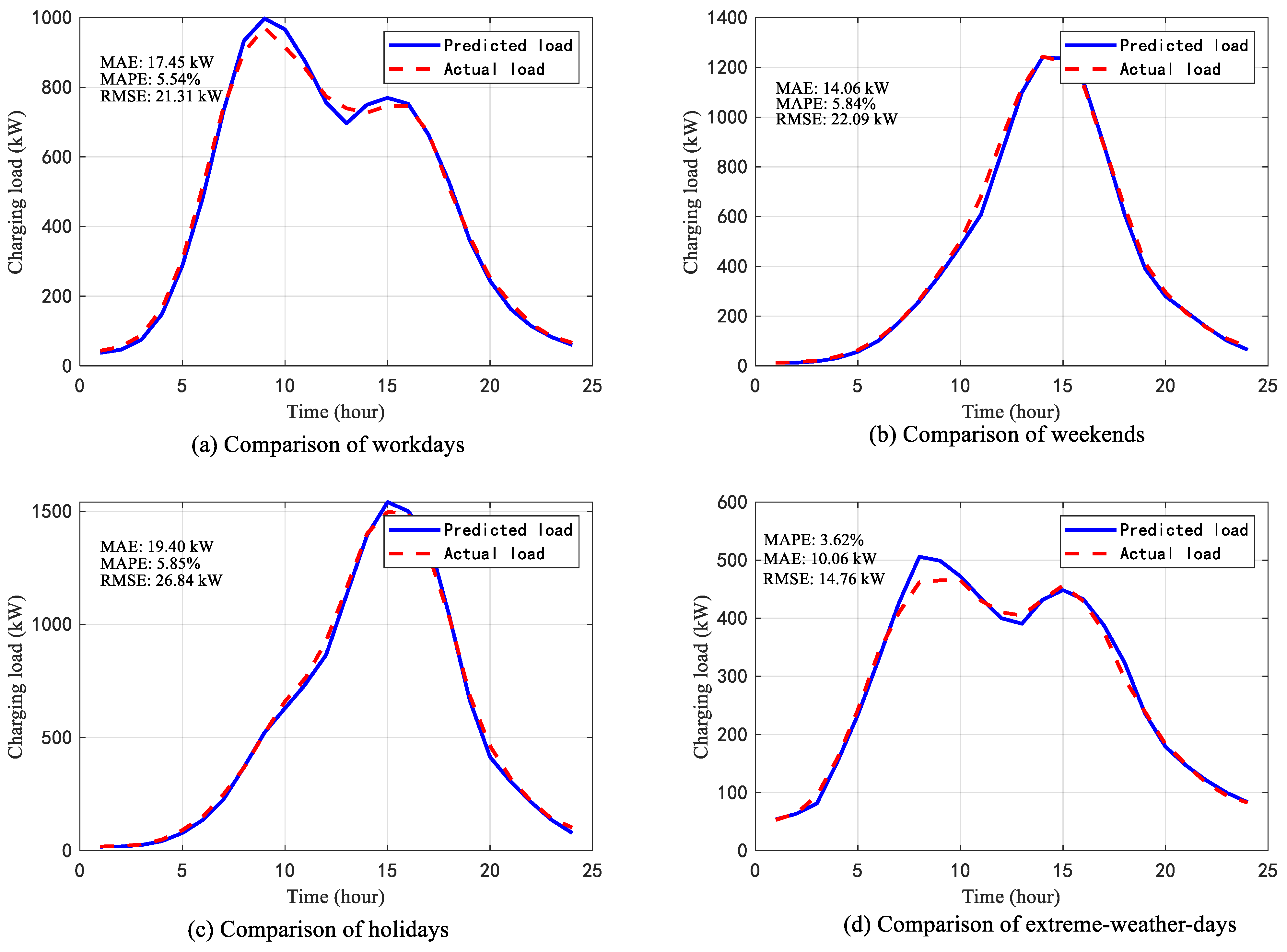 To capture realistic load characteristics for this section, the dataset was first constructed from 30 consecutive days of measured traffic and charging load data at a representative highway charging station. This base dataset was then expanded to incorporate diverse operating conditions. Specifically, four representative daily patterns—workdays, weekends, holidays, and extreme weather days—were extracted from empirical traffic flow images, normalized, and scaled to the observed peak values. Each day in the 30-day period was assigned a type consistent with the actual calendar, and the corresponding flow and load profiles were generated using Gaussian perturbations (≤3% of the mean flow) and Monte Carlo simulations (100 iterations per scenario). Vehicle composition, state-of-charge distributions, and user charging behaviors were modeled according to empirical ratios and behavioral patterns, ensuring that the generated data preserved the statistical properties of the measured dataset while extending its variability across traffic, weather, and vehicle scenarios. Based on these data, the charging loads of the four service area stations within the combined section were predicted, providing the foundation for comparative analysis in subsequent sections.