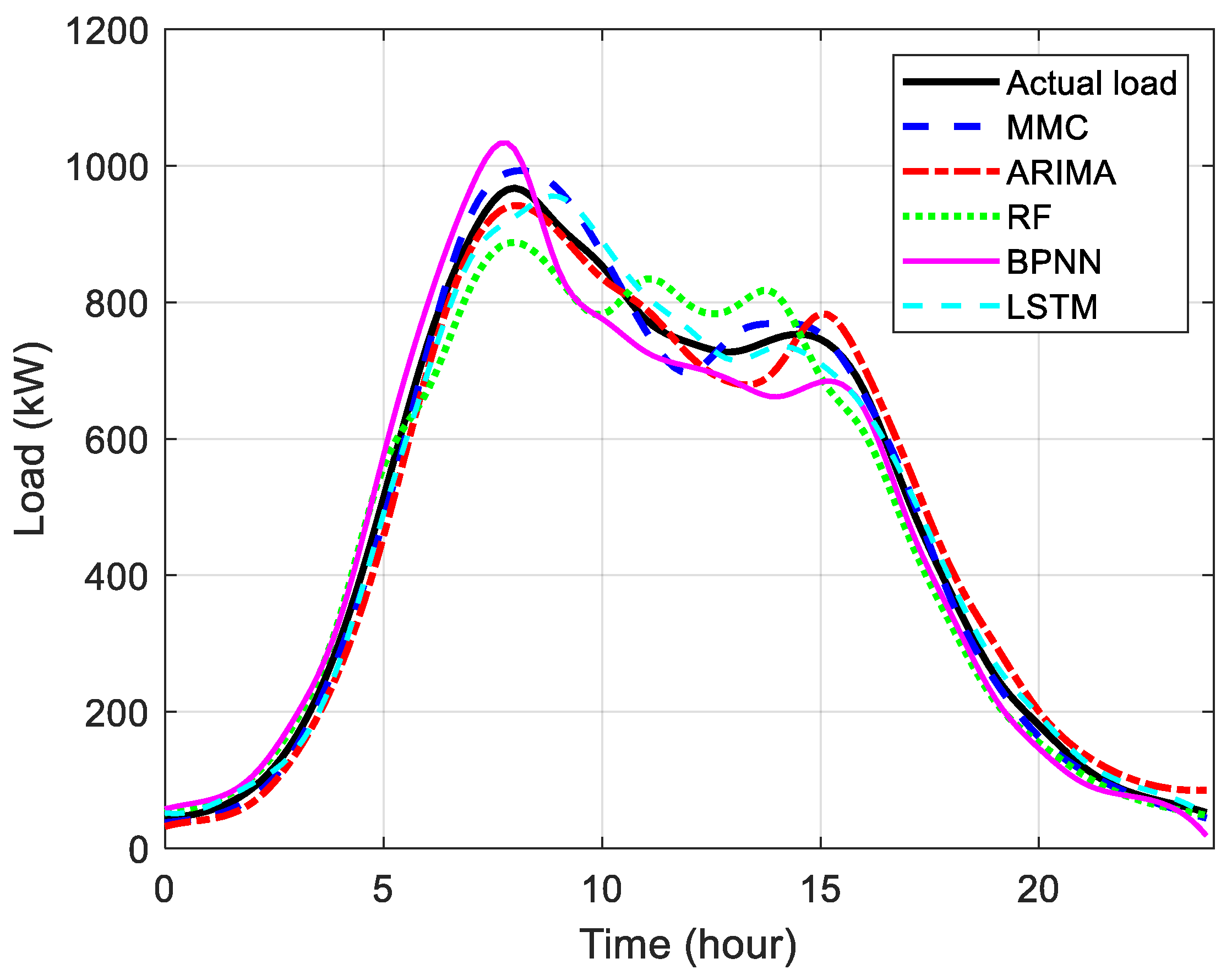 By comparing the four common prediction curves, it can be seen that they are very close to the actual load value in terms of trend and amplitude. In order to further prove the optimization effect of the hierarchical Markov chain Monte Carlo simulation method, this paper selected typical scenarios on weekdays and used ARIMA, the random forest method, a BP neural network, and an LSTM neural network to compare the prediction results, using evaluation indicators such as the MAPE and R