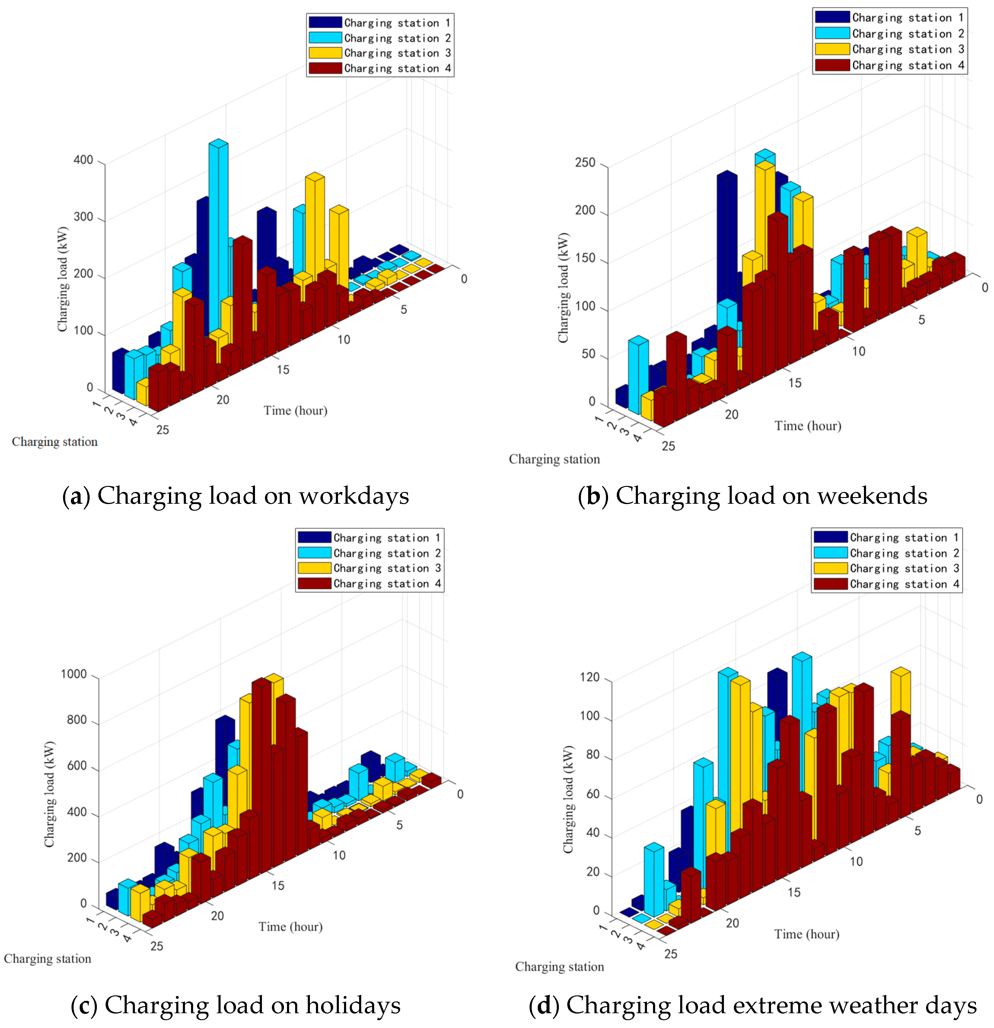During holidays, the charging demand across all four stations increases, and the charging times become more concentrated. Notably, Stations No. 3 and No. 4 exhibit larger loads, indicating heavier traffic volumes along their respective road sections, likely linked to large-scale vehicle transfers and directional holiday travel patterns. Under extreme weather conditions, the charging loads of all stations decrease markedly, with reduced variability both across stations and throughout the day. Although the absolute demand is lower in this case, the temporal dynamics of load change still reveal the influence of shifting user decisions and traffic flow characteristics.