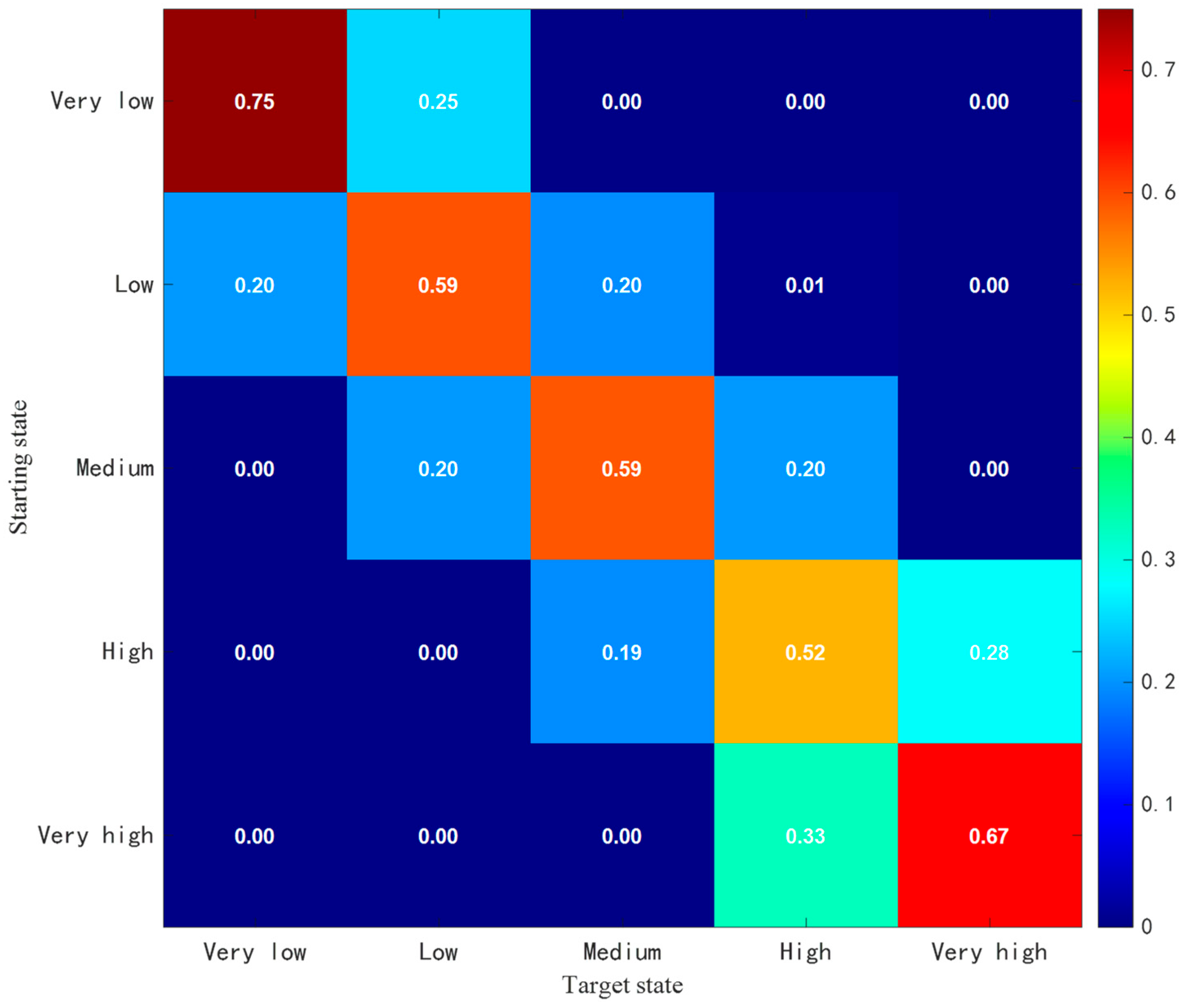 According to the theory of hierarchical Markov chain Monte Carlo simulation, the distribution of charging load corresponds to the probability distribution of traffic flow and affects the SOC distribution of individual vehicles under different traffic flow conditions and the charging behavior decision-making state of individual users. Taking the traffic flow density distribution as an example, five traffic flow states can be obtained through the state transition probability matrix of the Markov chain, namely, very low, low, medium, high, and very high. The transfer rule is that the car flow density cannot change abruptly and should be continuous in the peak stage. Therefore, the problem can be explained by drawing the Markov chain state transition matrix of the traffic flow state: