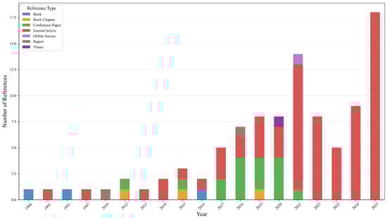 Figure 2 illustrates the distribution of reference types analyzed in this survey. The prevalence of journal articles, followed by conference papers, underscores the robust academic foundation upon which predictive maintenance research is built.