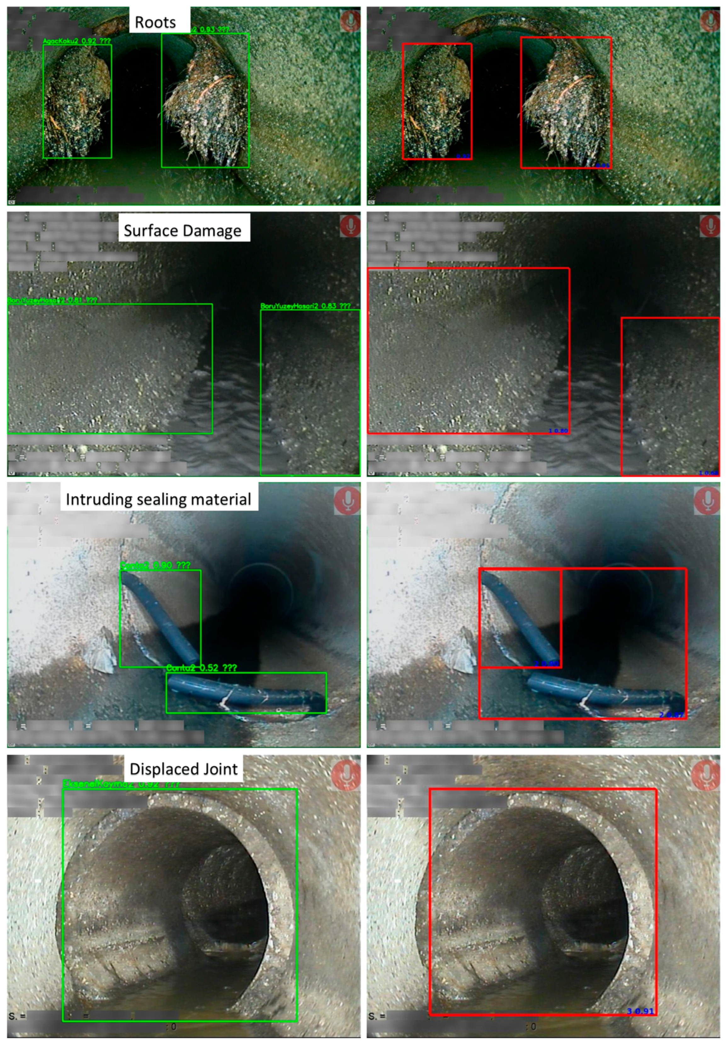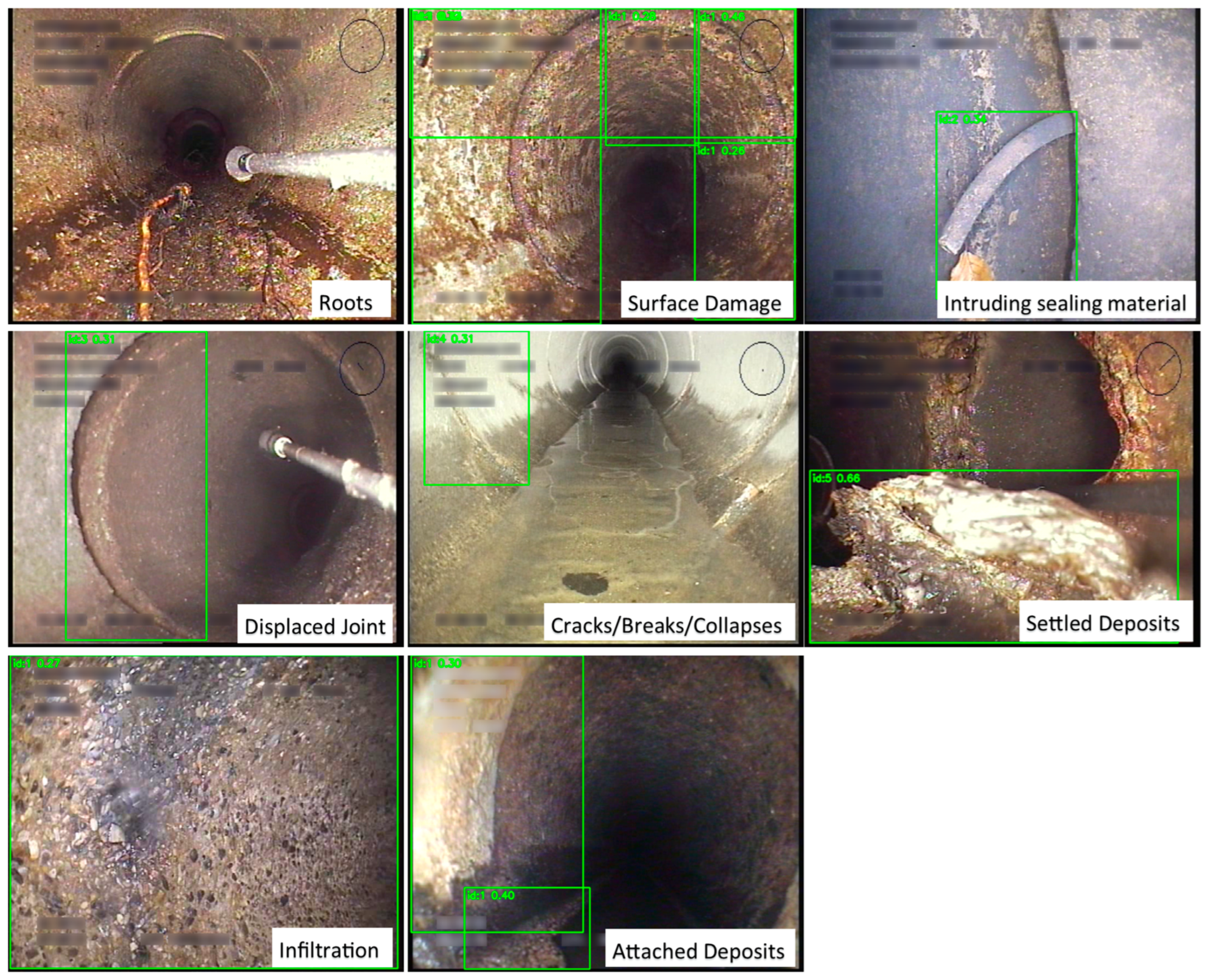 19] both report high AP values above 83% for roots and settled deposits using Faster R-CNN and improved YOLOv3, respectively, though these were tested on datasets from the United States under relatively controlled conditions. More recent work using the Sewer-ML dataset from Denmark [