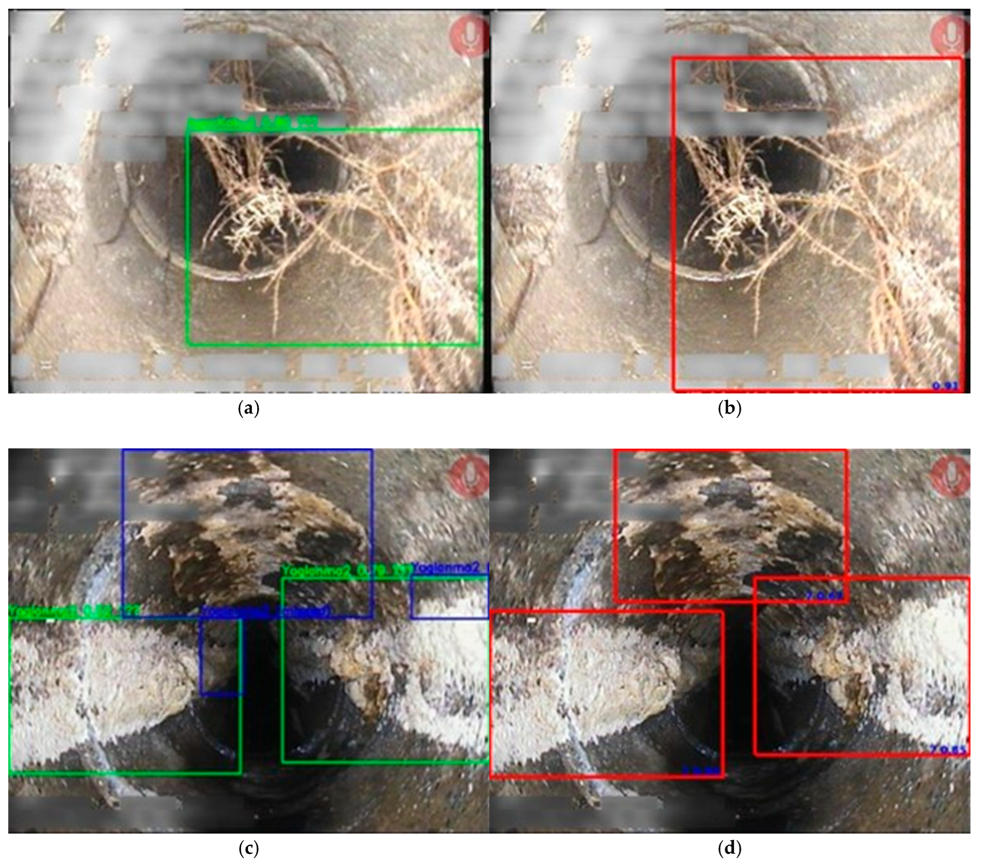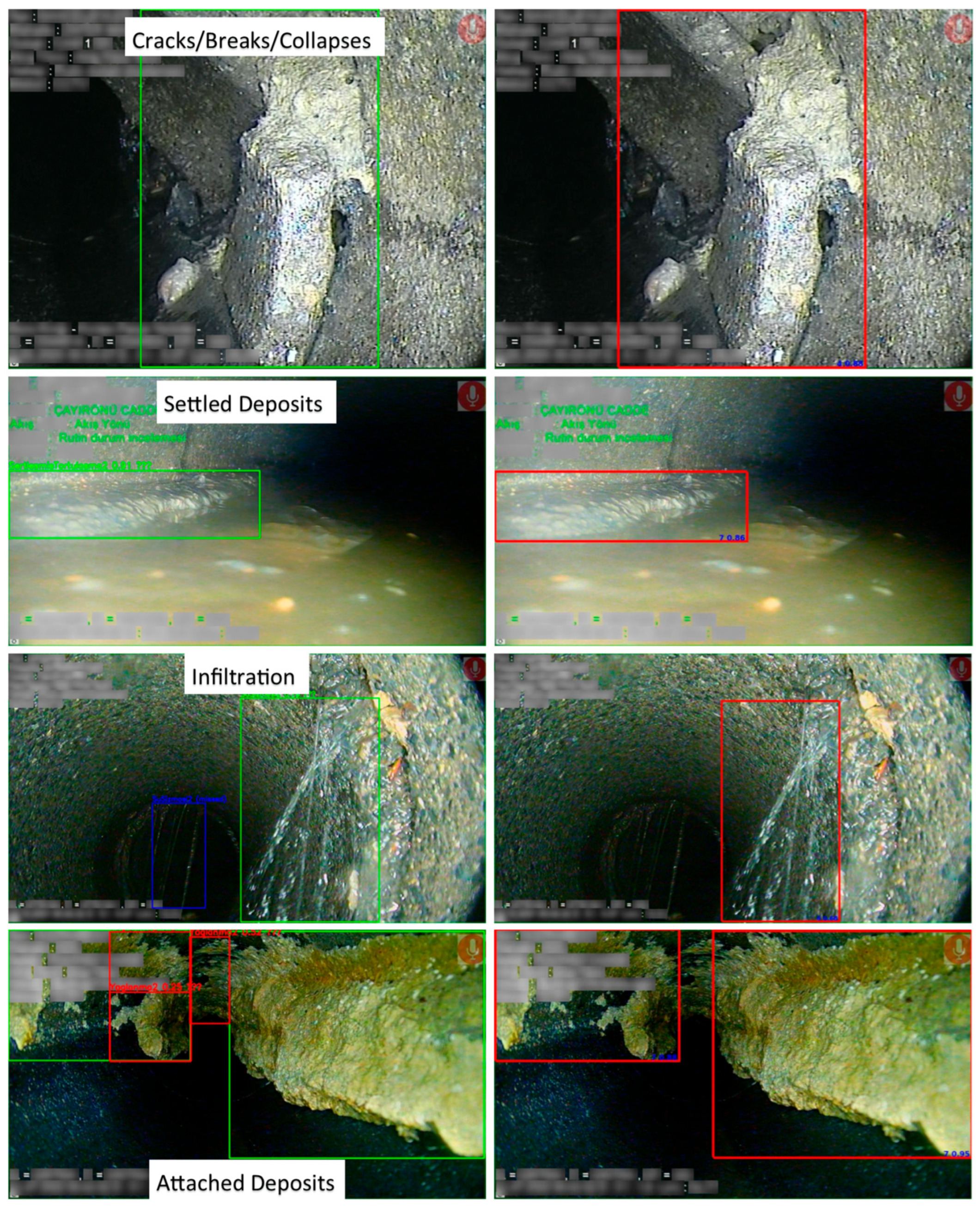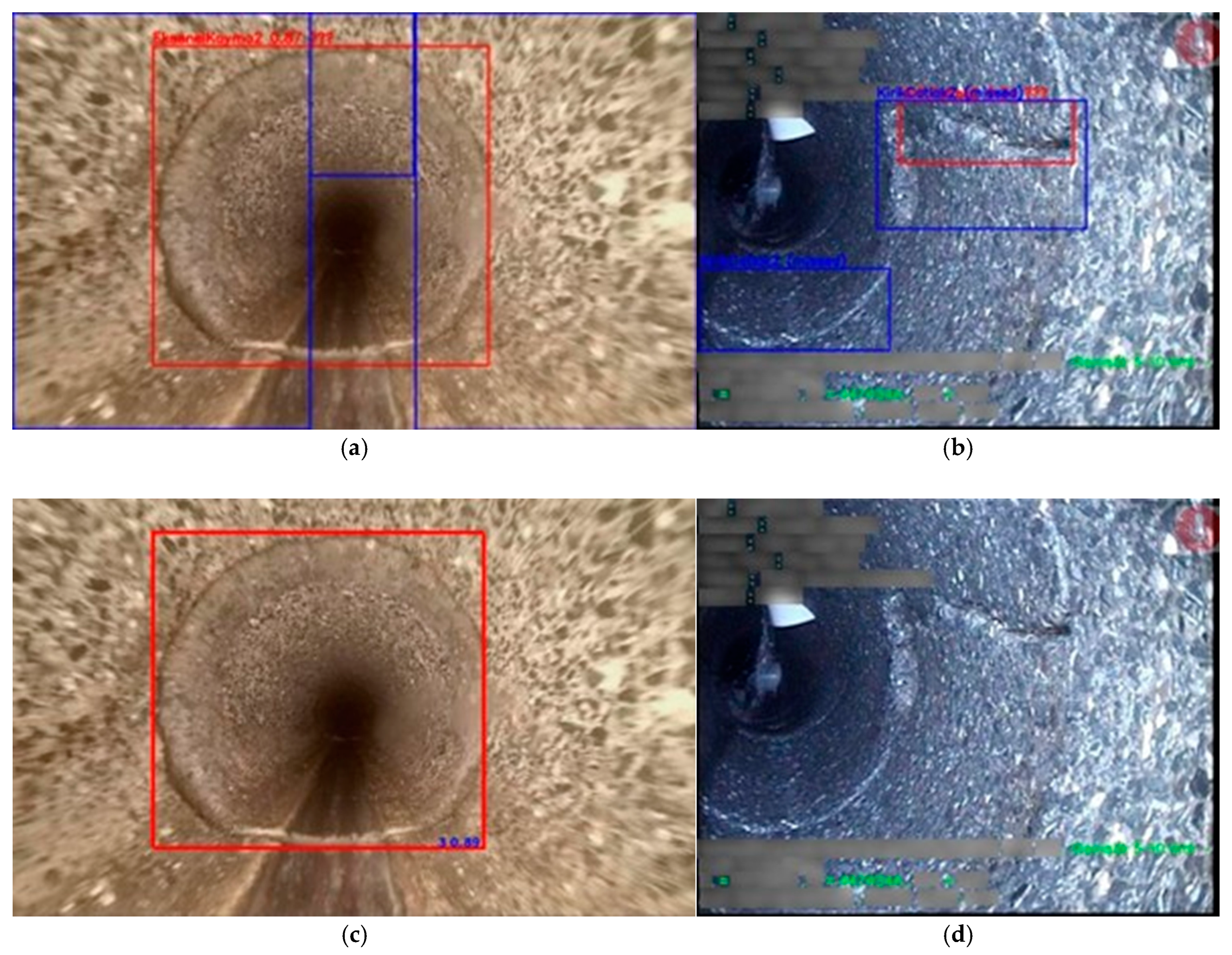 The quality of labeling also emerged as a significant factor. Operator-level analysis indicated that human annotators achieved only 50–60% detection accuracy, partly due to the volume of video data and the inherent difficulty of distinguishing subtle defects. Mislabeling, class grouping (e.g., cracks, breaks, collapses treated as one class despite their variability), and inconsistent annotation standards reduced the models’ ability to generalize. For example, excessive grouping of defect types contributed to poor Crack/Breaks/Collapses performance, while reflection-induced false detections highlighted the need for stricter imaging protocols, such as limiting robot speed to reduce vibration and blur.
