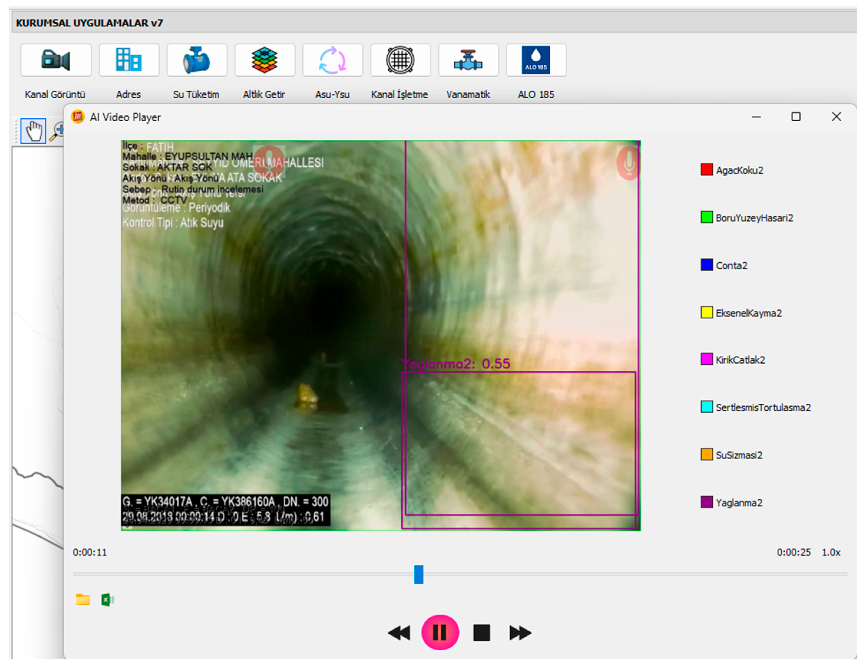 To demonstrate practical integration, a Python 3.12-based application within the QGIS 3.34 environment was developed. This tool bridges the gap between raw video analysis and actionable asset management insights. Inspection videos and their metadata, stored in a PostgreSQL 17.4 database and NextCloud Hub 9 (30.0.8) cloud storage, are queried and retrieved directly within the application. The selected pre-trained model, converted to the standardized ONNX format for framework interoperability, processes the video. Each frame is analyzed using OpenCV 4.11, with defects identified and annotated with colored bounding boxes and labels in real-time.