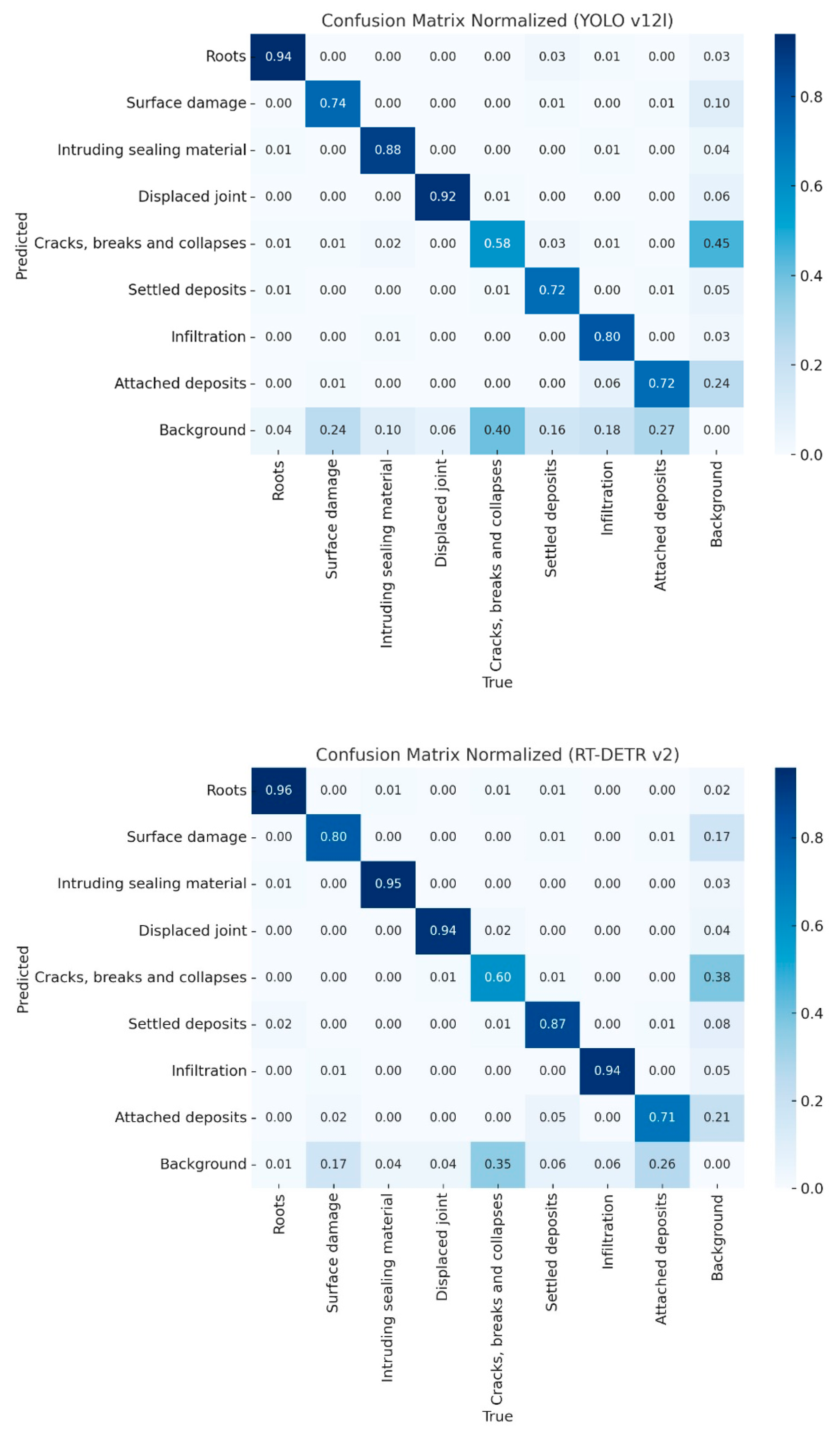 Figure 8). A similar challenge arose for the Attached deposits class, with a background confusion rate of 0.27 and 0.26 for YOLOv12l and RT-DETR-v2, respectively. These errors are not solely attributable to model deficiencies but instead reflect the inherent difficulty of the task. Fine cracks, attached deposits, and subtle infiltration signatures often share visual characteristics with pipe textures, stains, water streaks, or reflections, making them difficult to distinguish even for human inspectors.