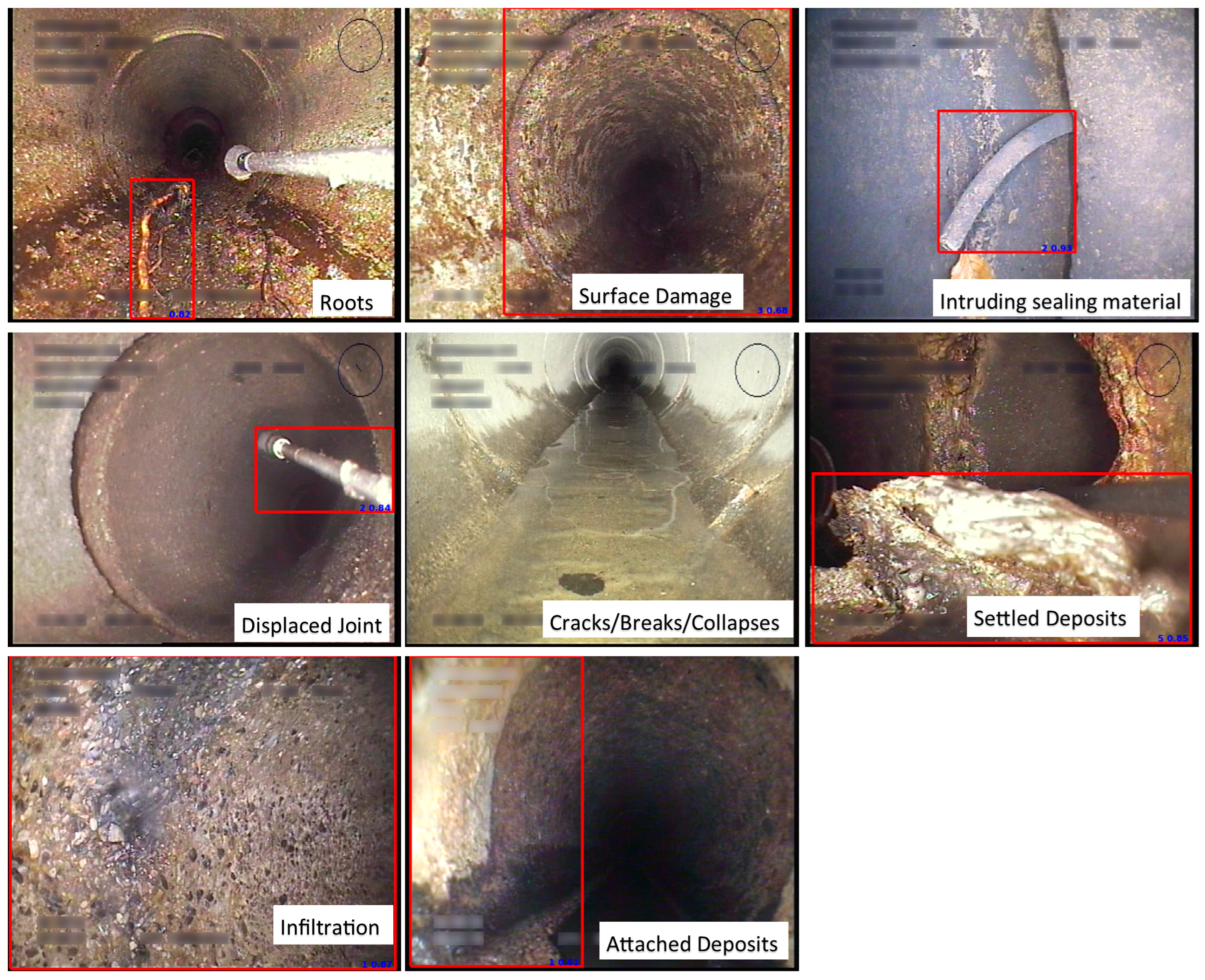 The dataset is not naturally balanced, reflecting the inherent imbalanced distribution of defects in real sewer systems. For instance, cracks and attached deposits are more prevalent than roots or infiltrations. This intentional preservation of class imbalance allows for the development of robust models to real-world operational conditions. The final dataset consists of 13,491 high-quality, annotated images ready for model development. A sample of annotated images from the ISWDS, showcasing the variety of defects and conditions is presented in