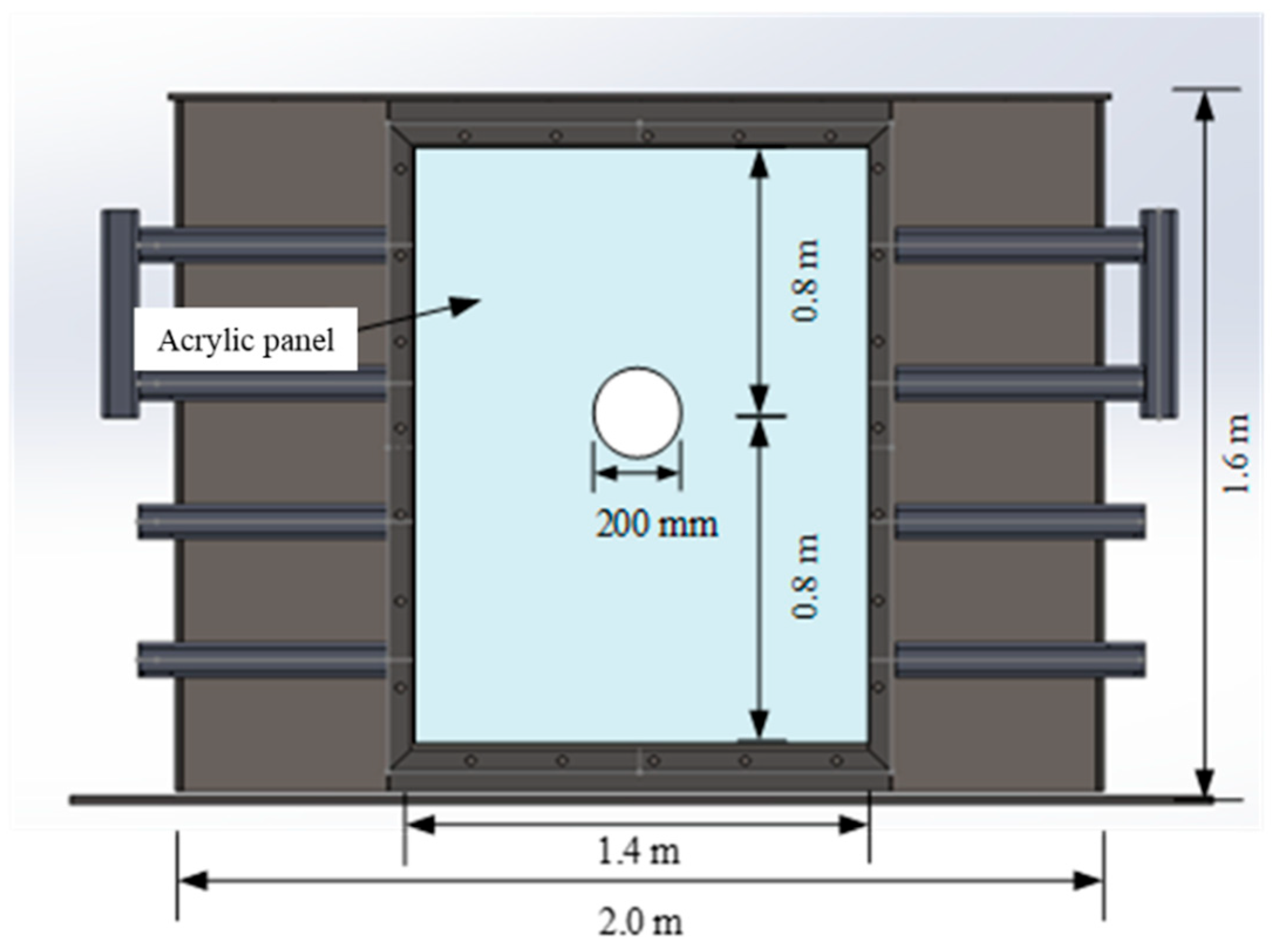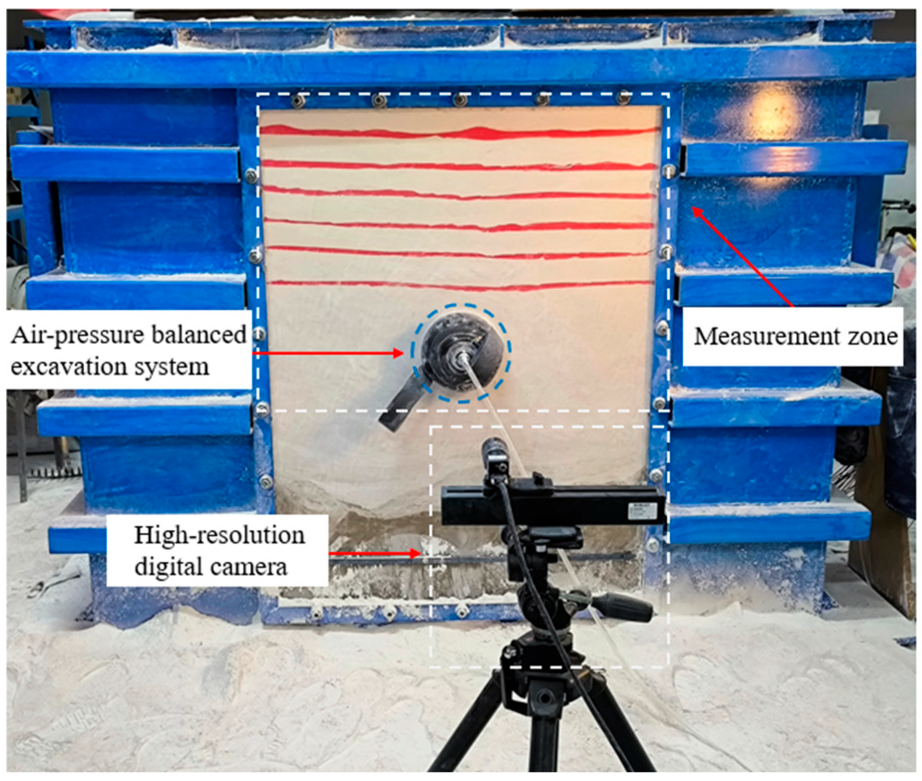 The physical model test was conducted in a model tank with dimensions of 2.0 m (L) × 0.5 m (W) × 1.6 m (H). The front face of the model tank was fitted with a 2 cm-thick transparent acrylic plate to facilitate direct visual observation of the tunnel excavation process. On both lateral sides of the model tank, 20 cm-wide reserved areas were specifically designed for airbag installation to simulate bidirectional pneumatic loading. A schematic diagram of the experimental setup is presented in