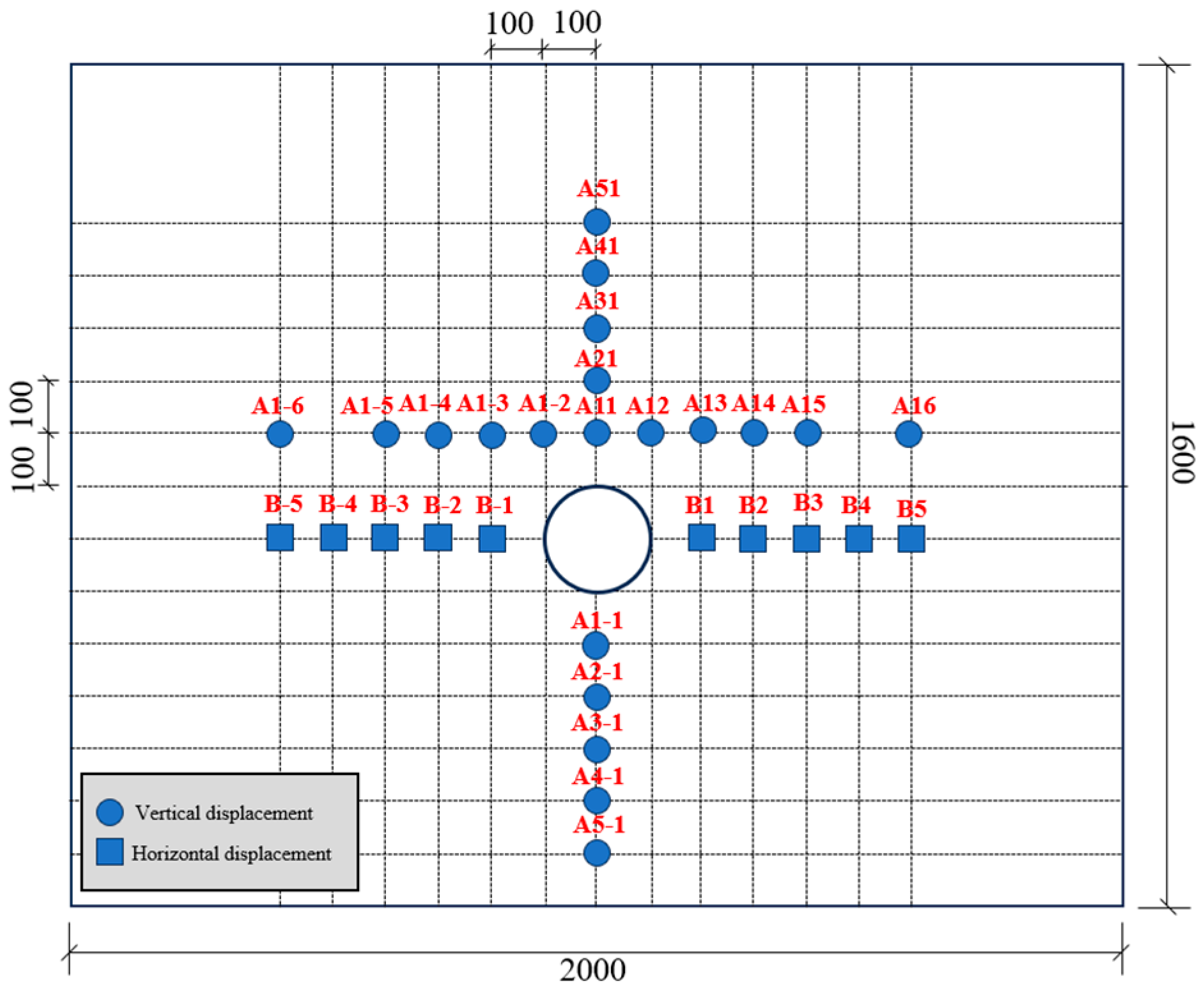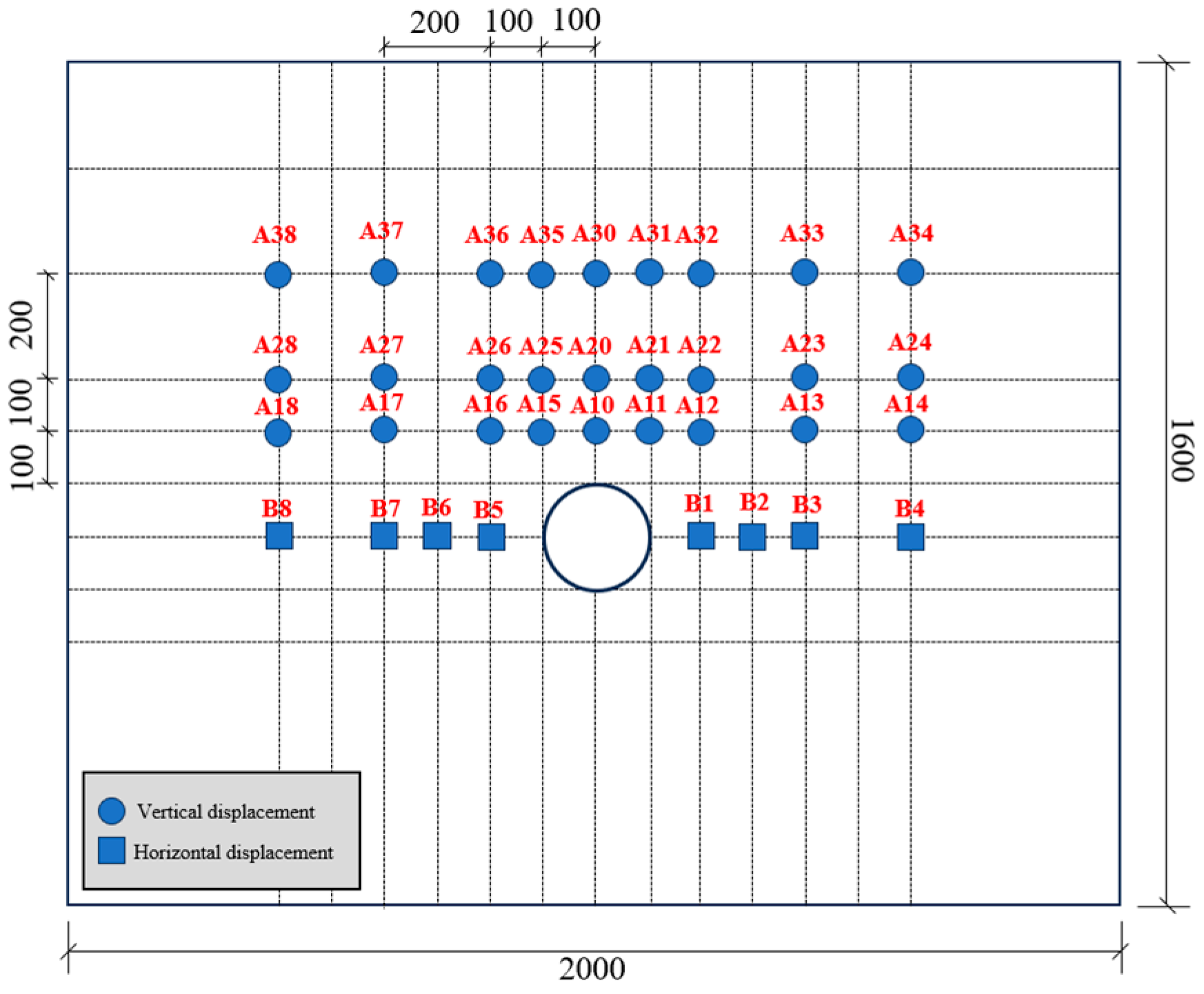 To characterize the displacement variation patterns of the tunnel during its excavation in the model test, the layout of displacement sensors—which are specifically designed to monitor the tunnel displacements—is presented in