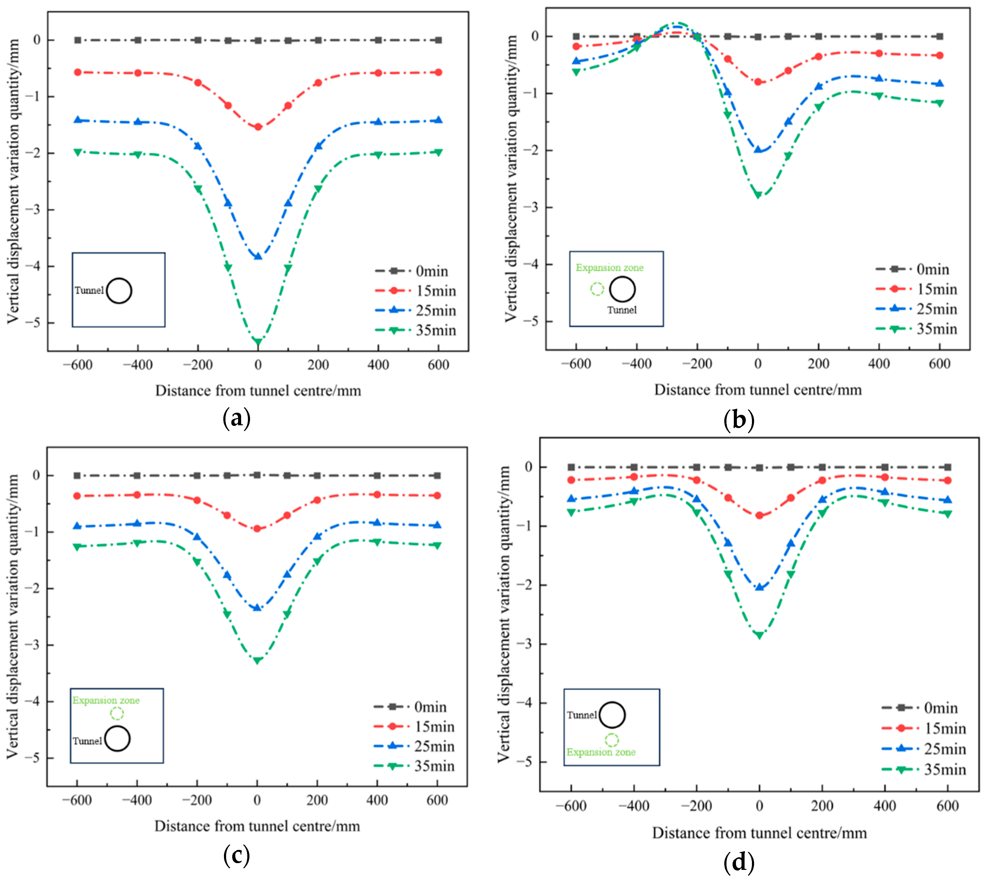 While maintaining a constant stress load of 50 kPa at the top of the model, only the effect of different expansion positions on the vertical displacement of the tunnel-surrounding rock is studied. This experiment conducted destructive tests on tunnel rock mass under different expansion locations, including no expansion, vault expansion, arch waist expansion, arch side expansion, and arch bottom expansion. The vertical displacement variation patterns under the four different conditions are shown in