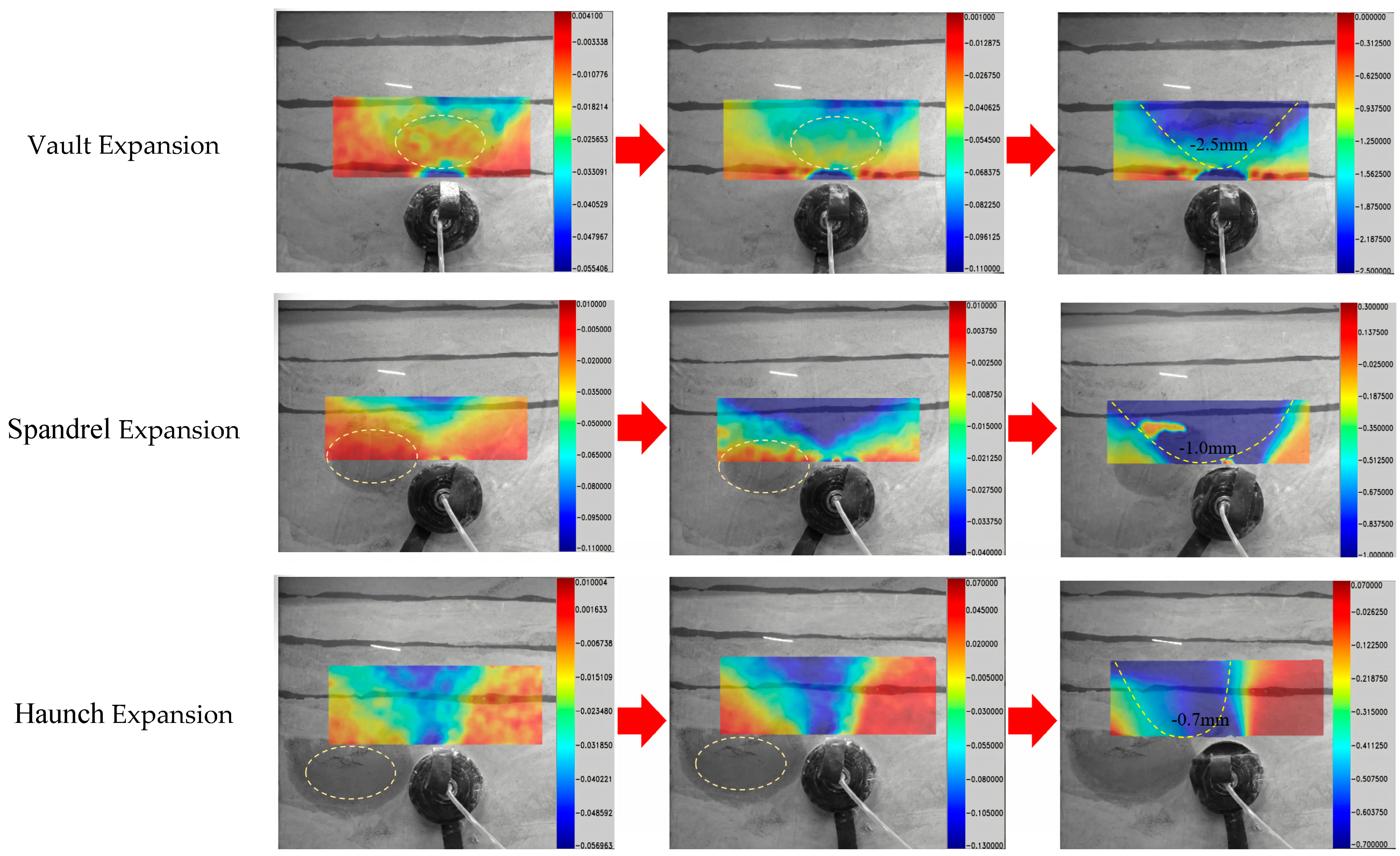 Reference Condition (No Expansion Zone): The displacement field exhibits typical symmetry. Horizontal displacement is ±1.85 mm (±0.05 mm error; symmetrically distributed: −1.85 mm left, +1.85 mm right), while vertical displacement dominates (maximum settlement: 3.24 mm ± 0.05 mm). The base heave is 2.21 mm ± 0.05 mm, with a vault settlement-to-horizontal displacement ratio of 1.75:1.