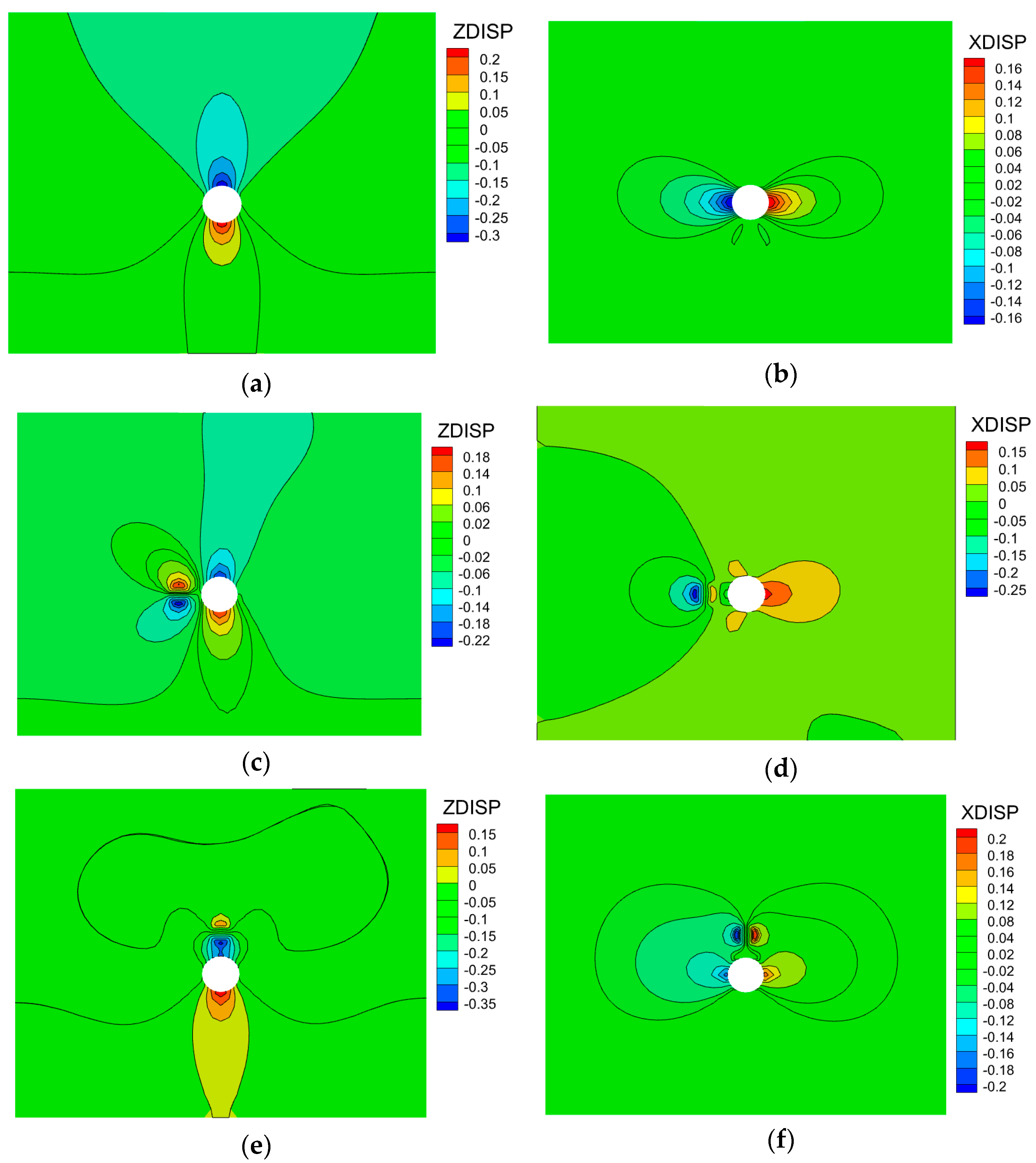 In summary, the above results indicate that horizontal expansion zones cause the displacement field to exhibit intensified asymmetric deformation, with a vertical displacement release rate of 26.7% [calculated as (baseline peak settlement-horizontal expansion peak settlement)/baseline peak settlement × 100% = (3.24 − 2.37)/3.24 × 100%]. Vertical expansion zones increase horizontal displacement and raise the maximum vertical displacement by 1.1 times (from 3.24 mm to 3.64 mm ± 0.05 mm). Numerical simulation results (error: <3% vs. laboratory test data) validate the influence patterns of expansion zones at different locations on surrounding rock deformation. Horizontal expansion primarily triggers structural imbalance instability, while vertical expansion exacerbates the risk of overall instability.