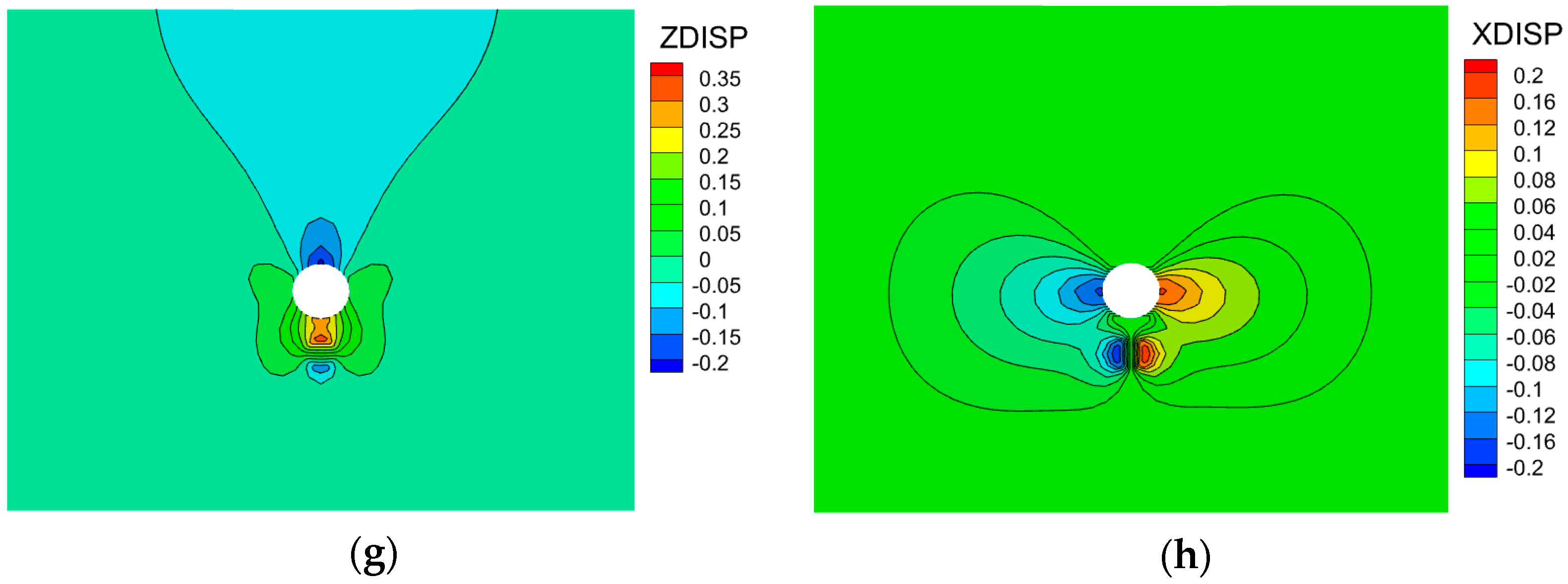 Left-Haunch Expansion Condition: Significant displacement field deflection occurs. Maximum horizontal displacement shifts leftward (left: 2.7 mm ± 0.05 mm; right: 1.7 mm ± 0.05 mm), with an asymmetry ratio of 60% [calculated as (left − right)/right × 100%]. The vertical displacement field migrates rightward, with peak settlement decreasing by 26.7% (from 3.24 mm to 2.37 mm ± 0.05 mm) relative to the baseline.