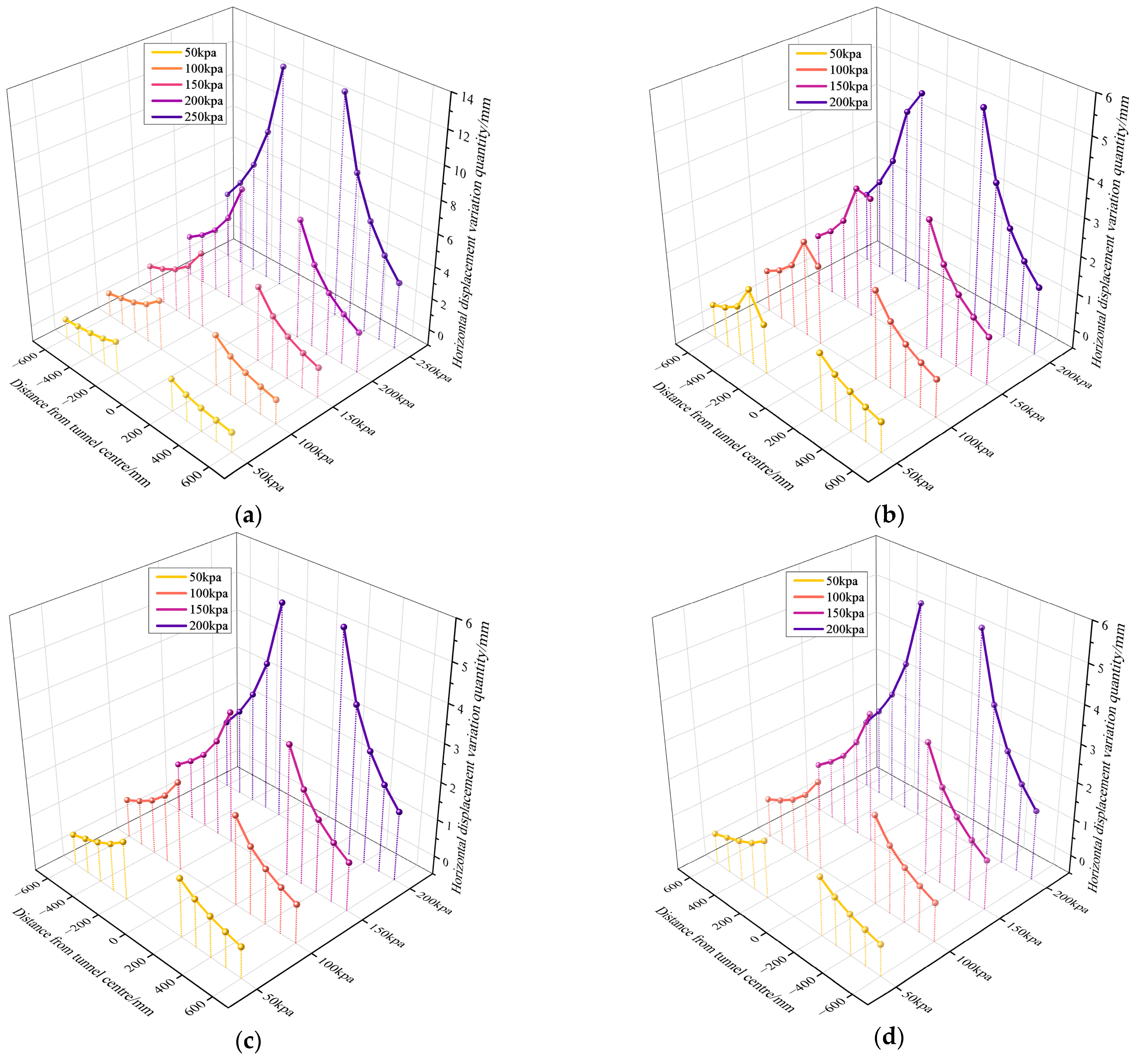 Figure 9. Under no-expansion conditions, the displacement curve remains symmetric, exhibiting a “tower-like” shape. Maximum displacement increases linearly with applied stress, reaching 8.05 mm at 200 kPa. Haunch expansion induces significant asymmetric deformation: at 200 kPa, the displacement difference on the expansion side reaches 60% (a >40% increase relative to the reference condition), forming a displacement concentration zone centered on the expansion zone. Although vault expansion maintains a symmetric distribution, the displacement influence range expands by 25%, and maximum displacement increases by 50% at 200 kPa. Invert expansion, by contrast, exerts a reverse constraint effect, reducing horizontal displacement by 20% via vertical support.