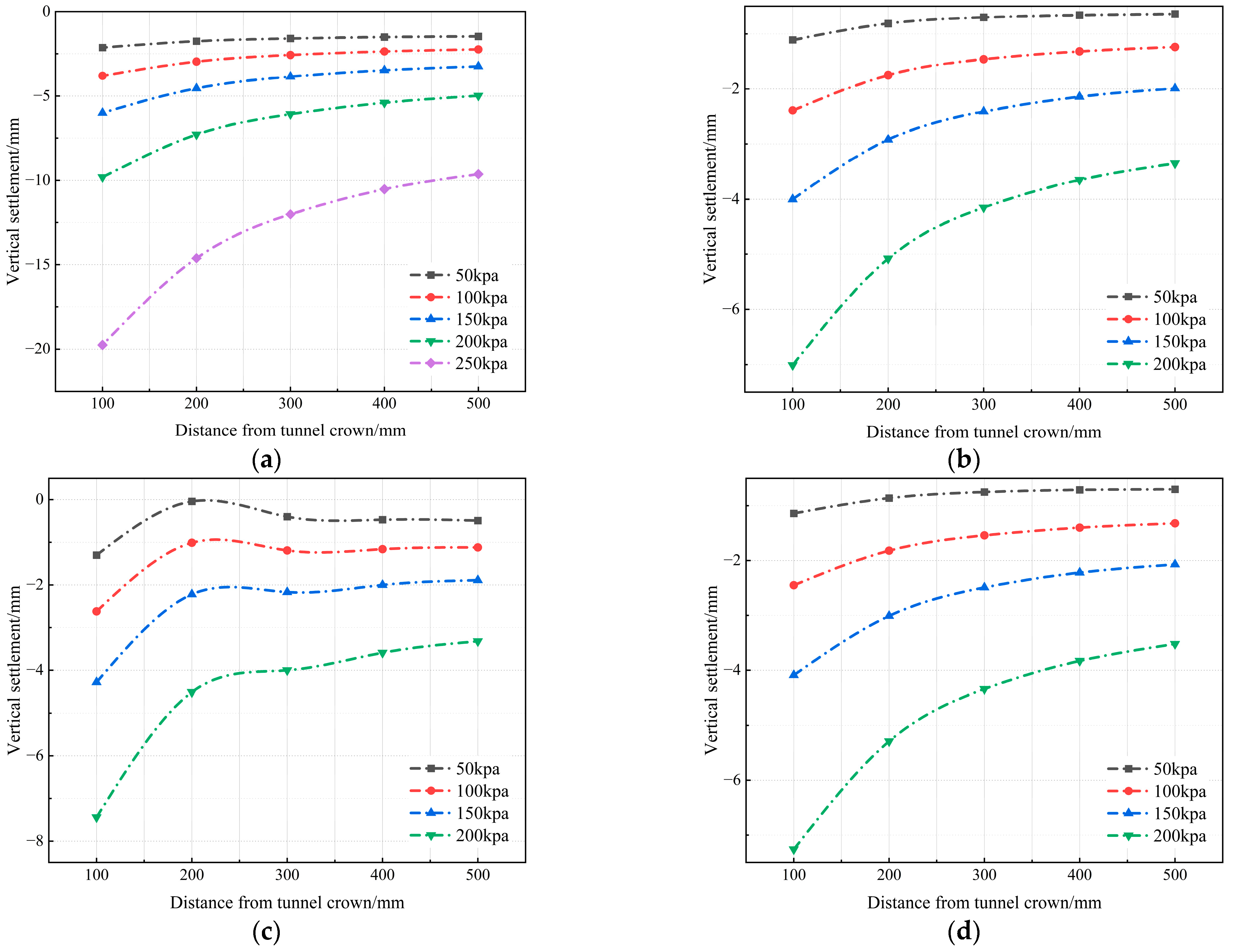 Table 6, with increasing applied stress, settlements under all conditions increase nonlinearly, and the influence of expansion zones on settlement gradually diminishes. This is because increased applied stress renders expansion forces unable to offset the geological stress of the tunnel-surrounding rock.