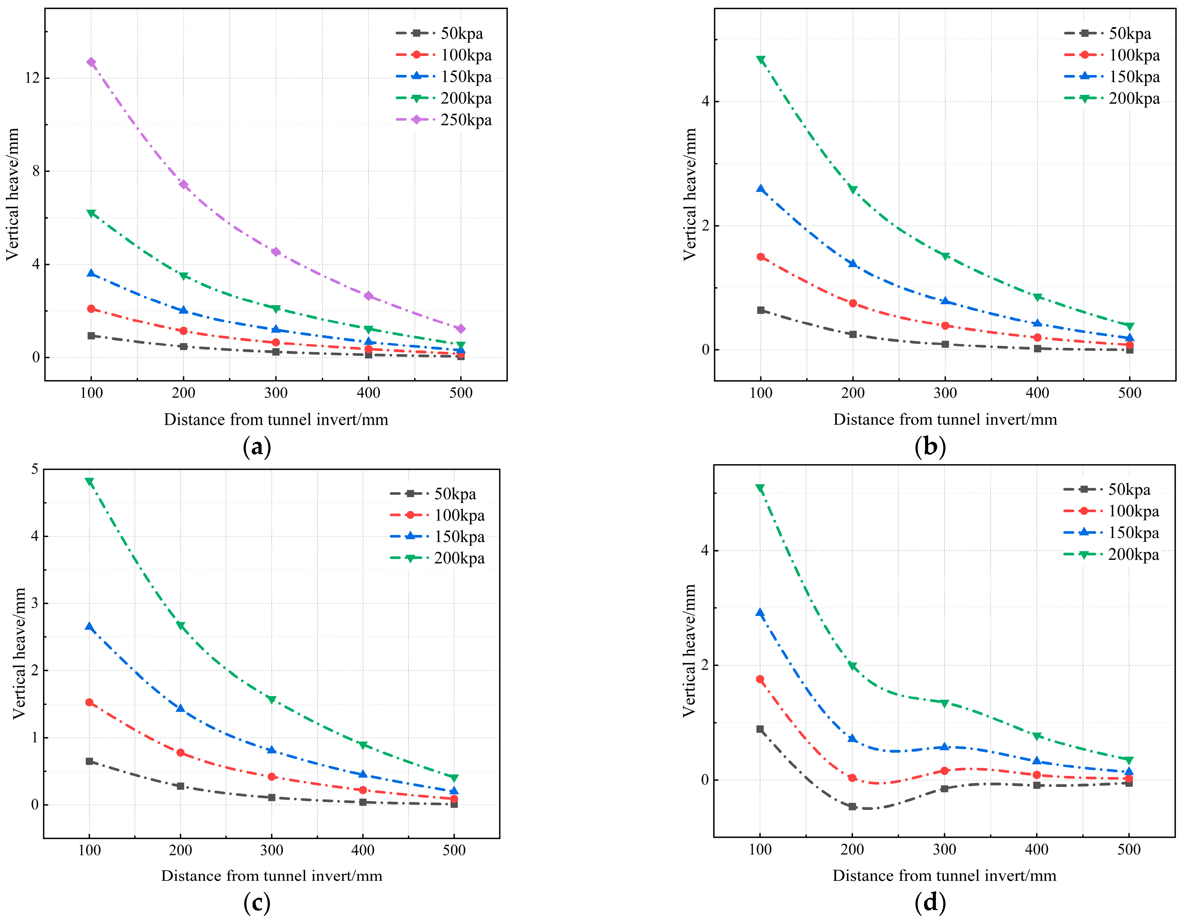 Table 6 illustrates the effect of expansion location and applied stress on tunnel vertical displacement (vertical displacement measurement error: ±0.01 mm). As shown in