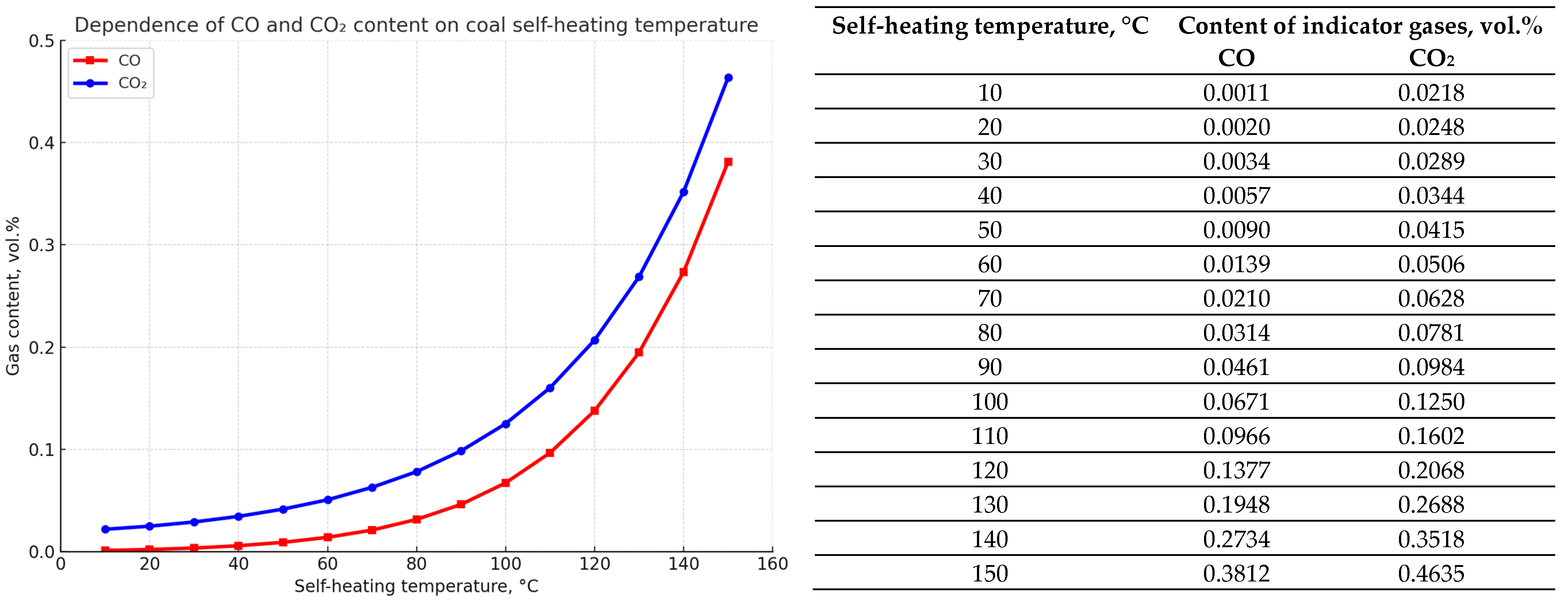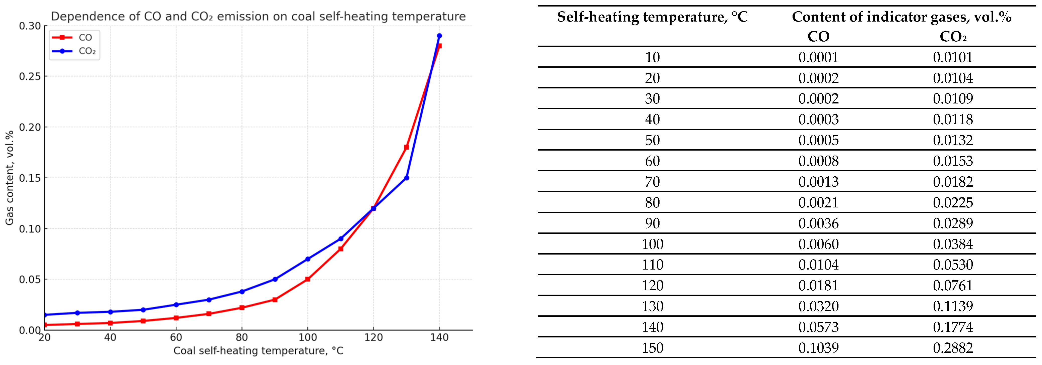 Although the presented experimental correlations were established primarily for the K12 and d6 seams of the Karaganda coal basin, it should be emphasized that their direct extrapolation to other seams in the basin, and especially to different coal-mining regions, is limited. The variability of coal composition—including the content of volatile matter, ash, inherent moisture, sorption capacity, gas content, and degree of metamorphism—has a decisive influence on oxidation kinetics and the dynamics of indicator gas emission. These differences can significantly shift the critical self-heating temperature and alter the quantitative parameters of the established dependencies.
