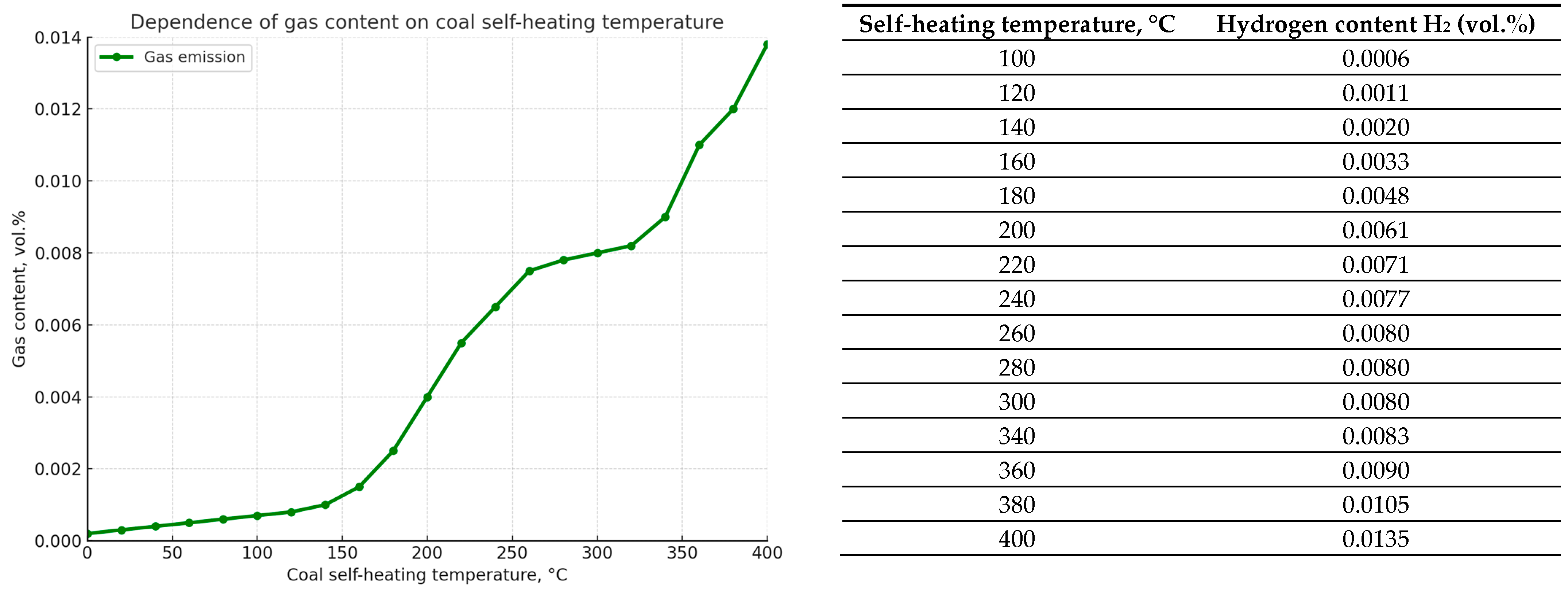Such delayed appearance of hydrogen implies that it is not a reliable indicator for the earliest stages of self-heating, when preventive measures are most effective. However, the sharp increase in H2 concentration above ~0.001–0.005 vol.% in the 120–300 °C interval is a critical diagnostic signal marking the transition from low-temperature oxidation to active pyrolysis and imminent spontaneous combustion. Therefore, hydrogen should be interpreted not as an early-warning indicator, but as a complementary parameter that confirms the escalation of the process.
