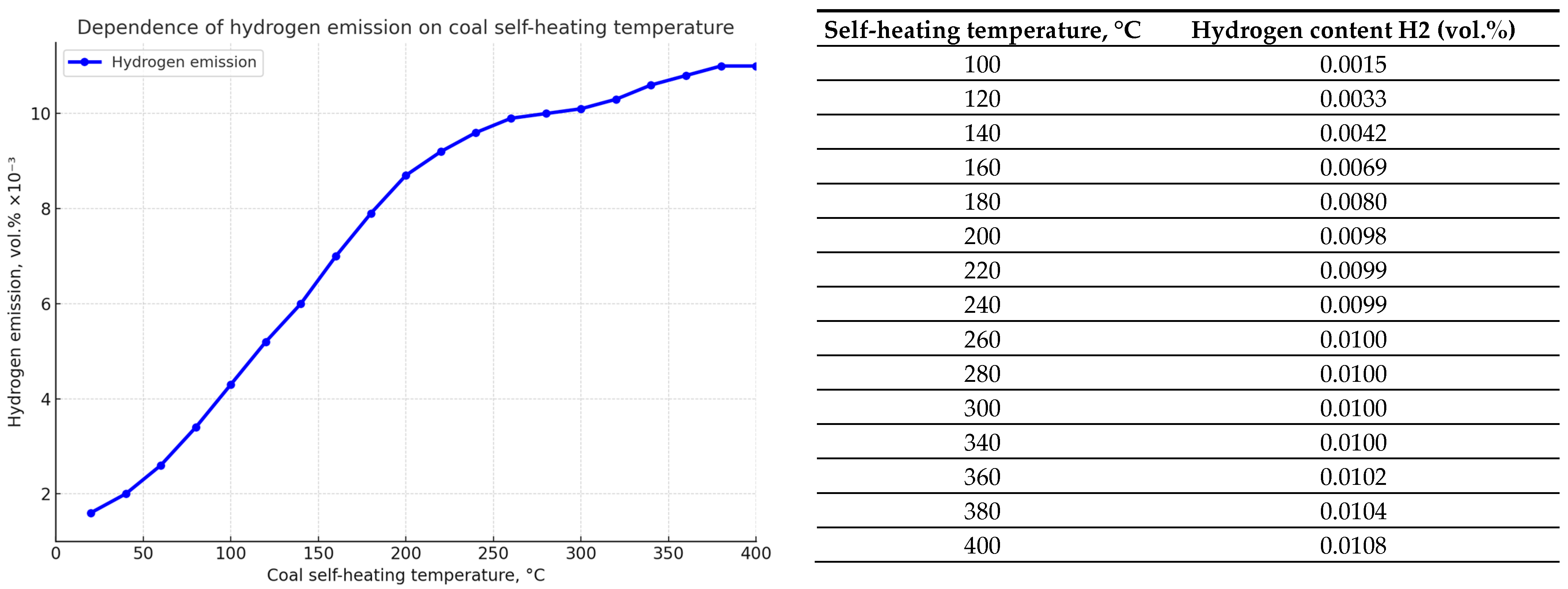 2 release is negligible. Noticeable hydrogen emission begins only when structural decomposition of macromolecular coal components occurs, leading to the release of volatile matter and secondary thermal reactions.