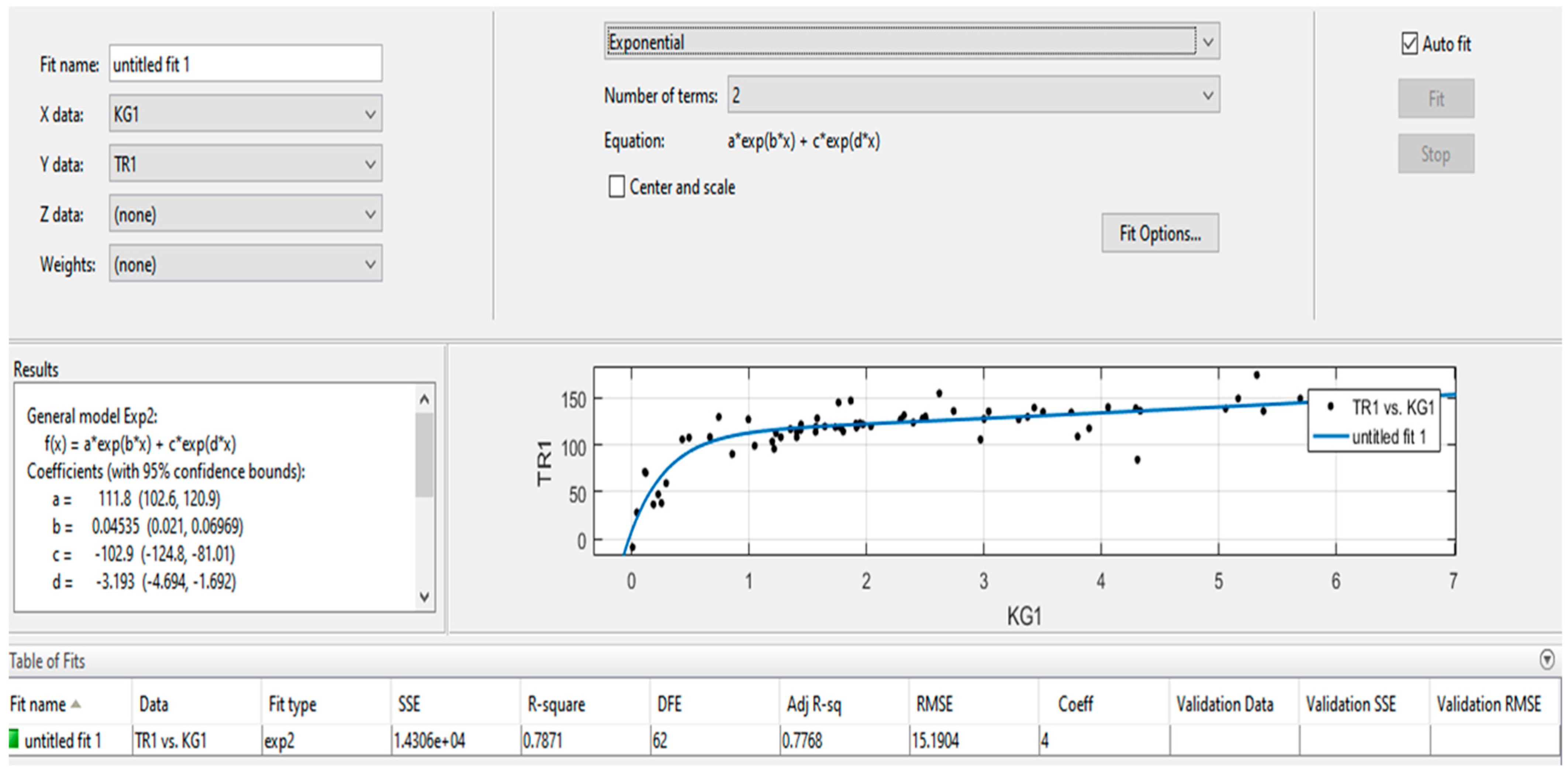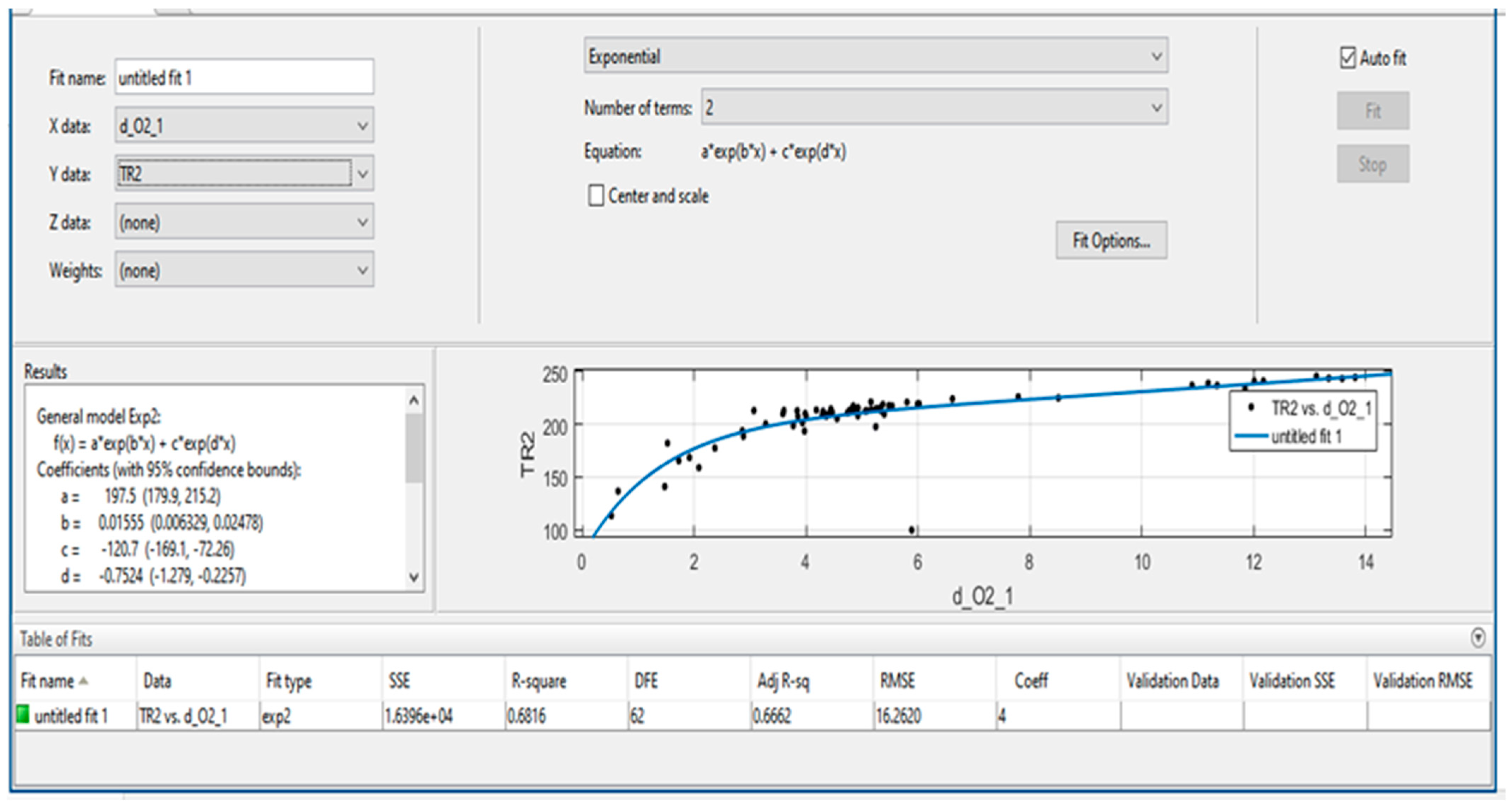 The constructed approximation curve (red line) shows good agreement with the experimental points and reliably describes the overall trend. The high coefficient of determination (R2 ≈ 0.68) and the relatively low root mean square error (RMSE ≈ 16.3) confirm the adequacy of the chosen model and the correctness of its application for analyzing gas exchange dynamics.