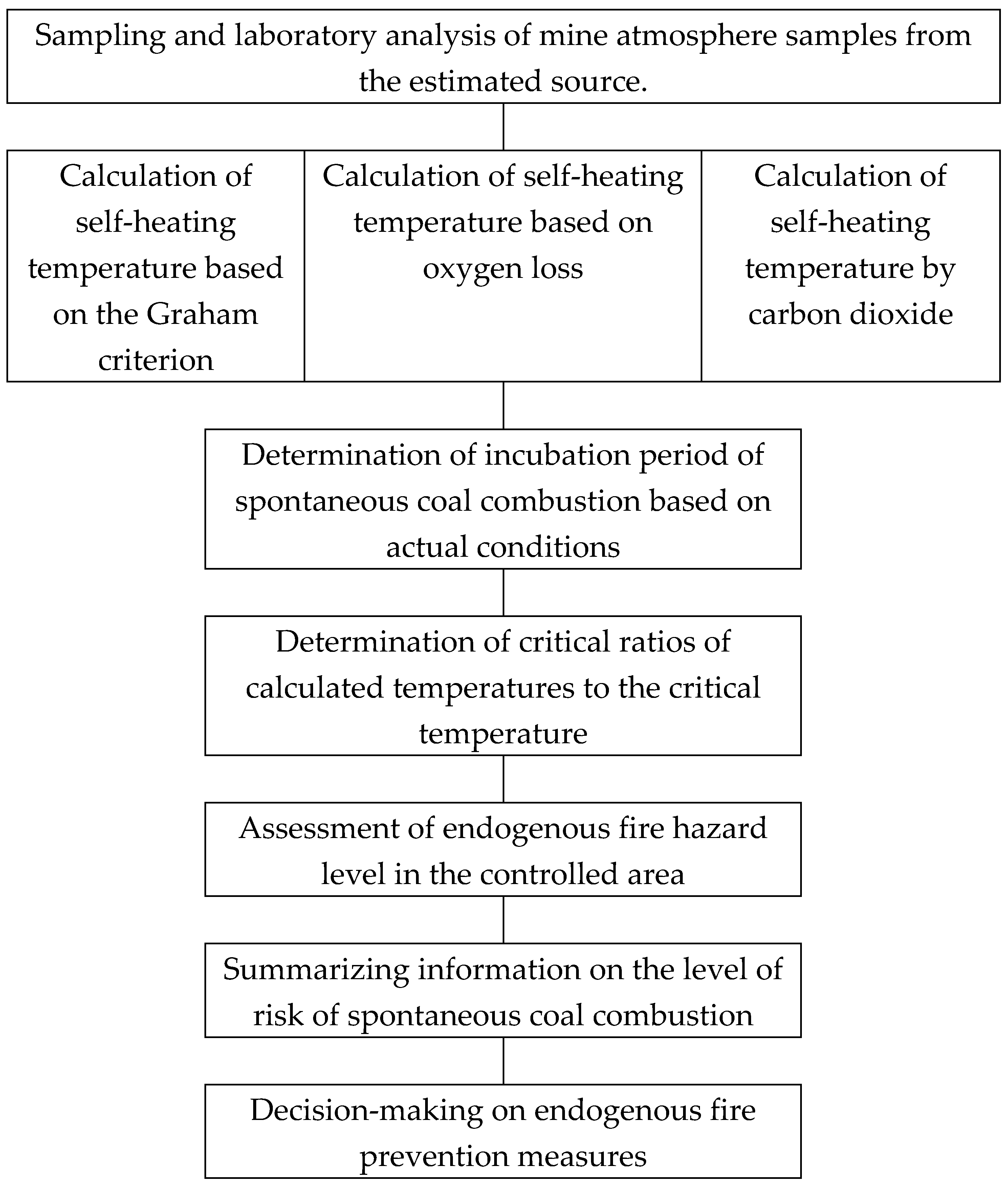 22], a method for assessing the parameters of the risk of endogenous fire occurrence based on the duration of the incubation period is presented. The method is based on the laws of heat exchange accompanying the process of self-heating of coal, taking into account the range of the heat release characteristic for the incubation stage.