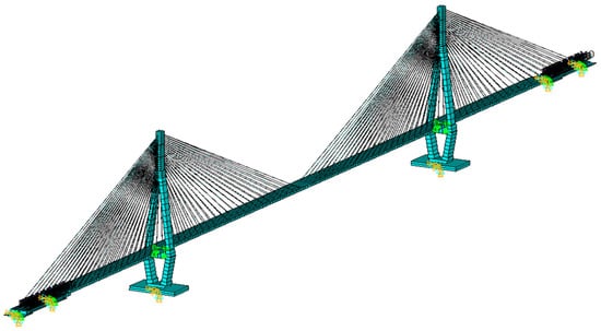 The long-span cable-stayed bridge was designed utilizing a combined steel box girder cable-stayed bridge structure, with a span layout of (82 + 262 + 688 + 262 + 82) m, where the main span was 688 m. The total length of the bridge extended to 1376 m. The finite element model of this bridge is shown in Figure 1.