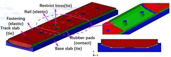 Track slab (4900 mm × 2500 mm × 200 mm): Modeled with solid elements and tie constraints.