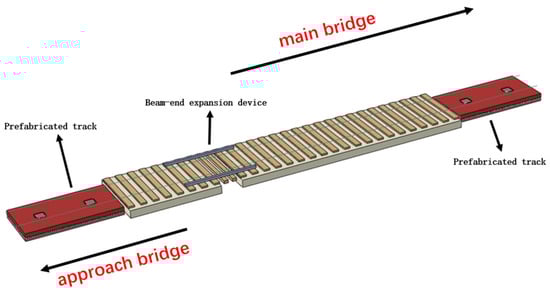By 2035, China’s national railway network is projected to reach approximately 200,000 km, forming a nationwide travel network with access times of 1, 2, and 3 h [1]. To achieve this goal, China has proposed prioritizing the planning and construction of urban rail transit systems in the Beijing–Tianjin–Hebei region, the Guangdong–Hong Kong–Macao Greater Bay Area, and the Yangtze River Delta [2]. Urban rail transit in China is still in its early stages. In regions with numerous mountains and rivers, developing long-span urban rail bridges has become a growing trend. Prefabricated tracks, with advantages such as high factory-controlled quality, high precision, high smoothness, and superior passenger comfort, have become the development orientation for laying track structures on urban rail bridges [3]. As the spans of urban rail bridges increase, beam-end expansion devices have become necessary structures for long-span urban rail bridges. Due to the significant structural differences between the beam-end expansion device and the track on a bridge, as well as the lack of a substructure for support, the beam-end expansion device is considered a weak point in bridge-based railway systems, drawing widespread attention from researchers. Wang et al. [4,5,6,7] and other Chinese and international scholars have conducted simulation analyses on the performance of beam-end expansion devices. Li et al. [8,9,10,11] carried out extensive research on the service performance of beam-end expansion devices. Guo et al. [12] studied rail expansion joints and beam-end expansion devices on bridges, optimized their structures, proposed layout schemes, and also numerically simulated and validated the performance of beam-end expansion devices. Regarding the Wuhu Yangtze River Railway and Highway Bridge on the Shangqiu–Hefei–Hangzhou High-Speed Railway, Zhang [13] for the first time had the rail expansion joint for ballasted tracks on a high-speed railway integrated with a beam-end expansion device, forming into a unified system, validating the practical engineering application value of beam-end expansion devices. Based on the Ganzhou Ganjiang Grand Bridge on the Changji–Ganzhou Passenger Dedicated Line, the world’s first long-span cable-stayed bridge with ballastless tracks, Zheng et al. [14], conducted theoretical and experimental research on the deformation adaptability of ballastless tracks on a long-span cable-stayed bridge. This study revealed the deformation characteristics of an integrated system of a long-span cable-stayed bridge and ballastless tracks. Hou et al. [15], using a long-span concrete arch bridge as a prototype, investigated the impact of changes in the parameters of bridge expansion devices for ballasted tracks on the dynamic responses induced by trains. Xiao et al. [16,17] established an accurate model linking the temperature field of the main girder to the displacement of expansion joints, enabling precise and reliable performance prediction of expansion joints in ballasted track bridges. Zhang et al. [18,19,20] and many other researchers optimized the parameters of beam-end expansion areas to achieve a better track structure and dynamic responses of trains. Meng [21], based on the data measured from the inspection of ballastless tracks on long-span bridges, analyzed the performance of structures in the beam-end expansion areas on two sides of the main bridge. The vertical vibration acceleration of the train’s axle box was found to be most affected by the track irregularity on the bridge. Lin et al. [22], through field tests, surveyed the stiffness variation in the beam-end expansion device areas on the bridge and analyzed the distribution rules of beam-end strain. Zhang [23], investigated the dynamic response of a coupled ballastless track-bridge model under long-term concrete shrinkage and creep effects. Existing research on the beam-end expansion adjustment areas of bridges primarily focuses on ballasted track bridges, wherein many long-span bridges are designed on high-speed railway lines. Few studies involved long-span urban rail bridges laid with prefabricated ballastless tracks, particularly in the beam-end expansion adjustment areas. This study surveyed a newly planned and designed urban rail cable-stayed bridge with prefabricated ballastless tracks and a main span of 688 m. The focus is on exploring the influences of thermal deformation in long-span urban rail bridges on the new prefabricated track and its expansion device transition area at beam ends.