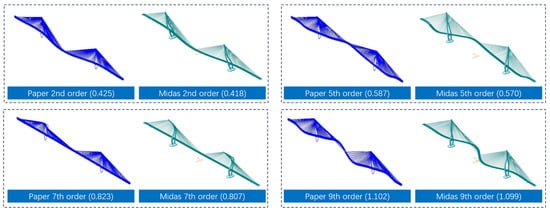 Based on previous research on the application of prefabricated tracks in long-span bridges [27], this study incorporates expansion joint devices at beam ends. To ensure accuracy, the first ten vibration modes and frequencies of the established finite element model were calculated using the multiple Ritz vector method. The results were then compared with the vibration modes and frequencies from the MIDAS model provided by the design unit. Based on previous research experience [28], to validate the correctness of the model in this study, it is necessary to ensure that the first ten mode shapes from the modal analysis of the model in this paper match those of the model provided by the design institute in terms of their manifestation. Additionally, the frequency error between corresponding mode shapes of the two models must be less than 10%. Notably, the design unit’s MIDAS model does not include expansion joint devices at beam ends, whereas the model in this study does. A comparison of the modal parameters is presented in Table 2, while the vibration mode shapes are compared in Figure 4.