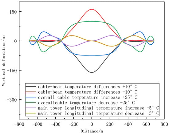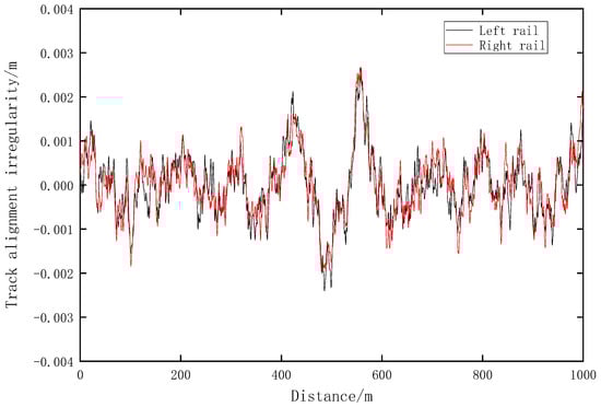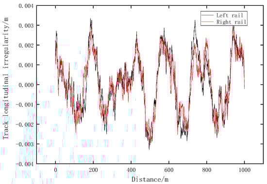 For the urban railway cable-stayed bridge with a main span of 688 m, the cumulated effects of random track irregularities and bridge deflection caused by temperature loads were treated as excitations acting on the track in the beam-end area, forming six working conditions used in this study. The random track irregularities consist of lateral and vertical random irregularities generated from the American five-level irregularity spectrum. The temperature loads include cable-beam temperature differences of +/−10 °C, overall temperature variations of +/−25 °C, and longitudinal temperature variations of +/−5 °C in the main tower. The random track irregularities are shown in Figure 5 and Figure 6. The temperature-induced deformation curve of the cable-stayed bridge is depicted in Figure 7.